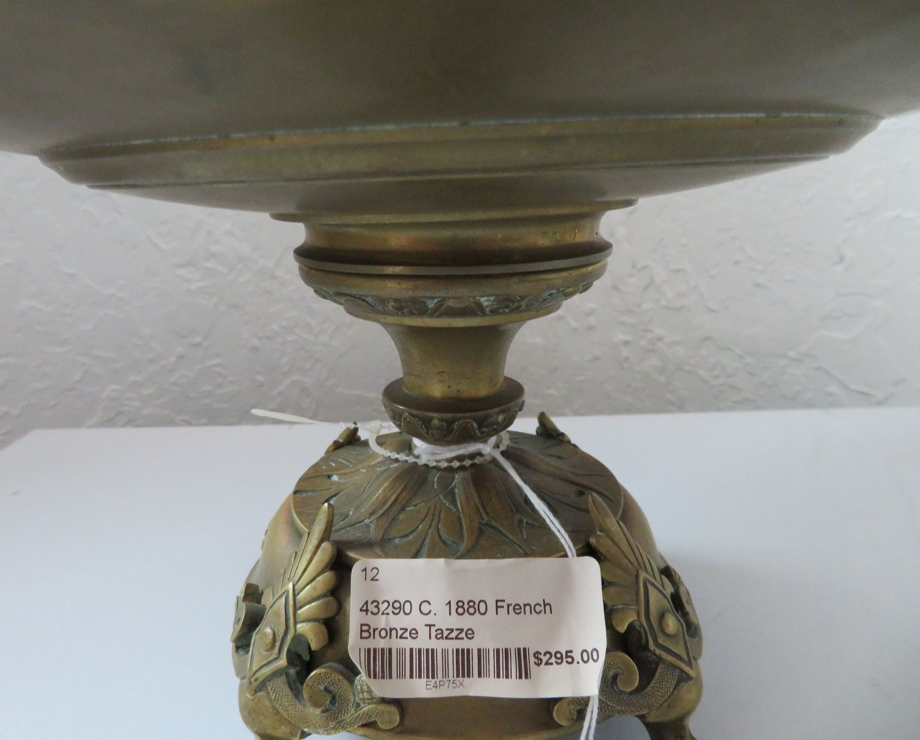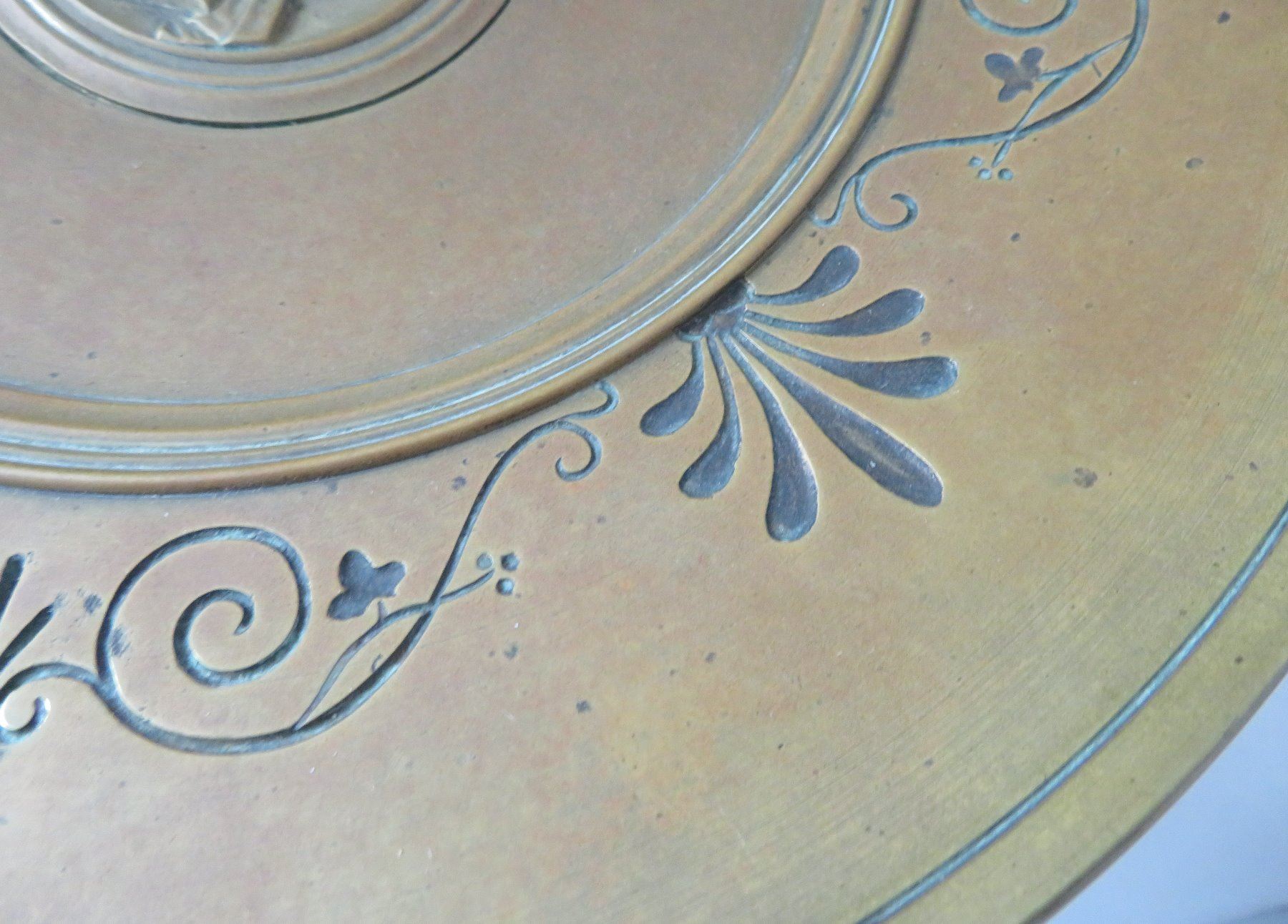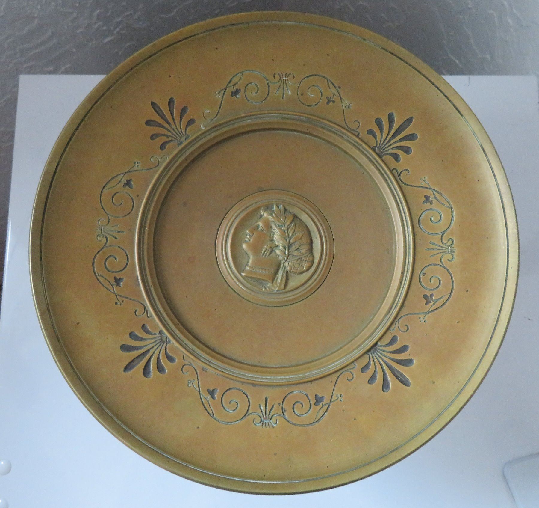 Antique French Bronze Tazza, c. 1880s. Made of bronze, the item measures 10 3/4" wide x 6" tall with a 5" base. French. 1880s bronze shallow, saucer-like dish with stand. Unique design, intricate work on feet. Center portions depicts female human figure. France. Condition: Good, patina, see images. Shipping: $45.00 USA estimate only, w/insurance and signature, due to weight and value.