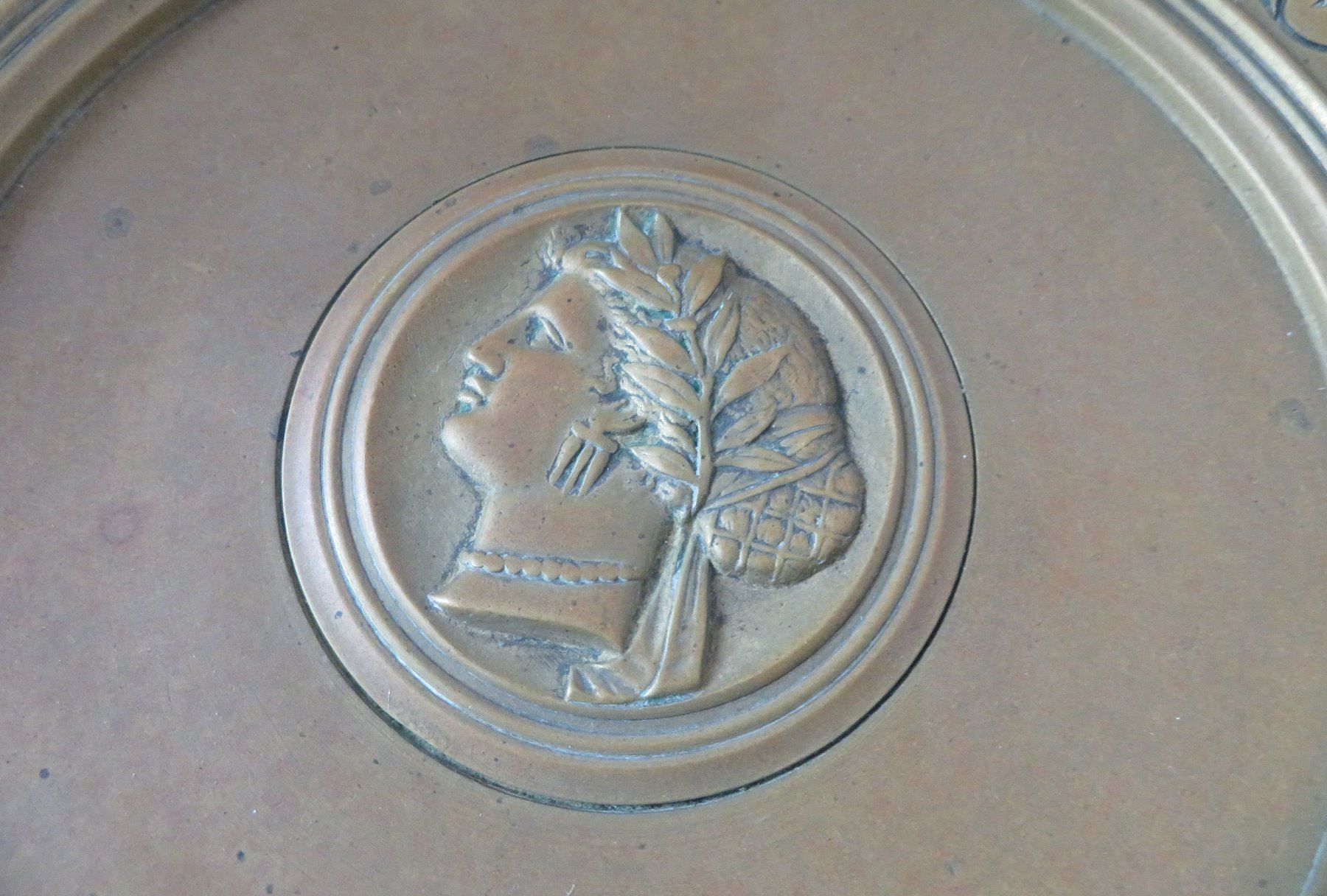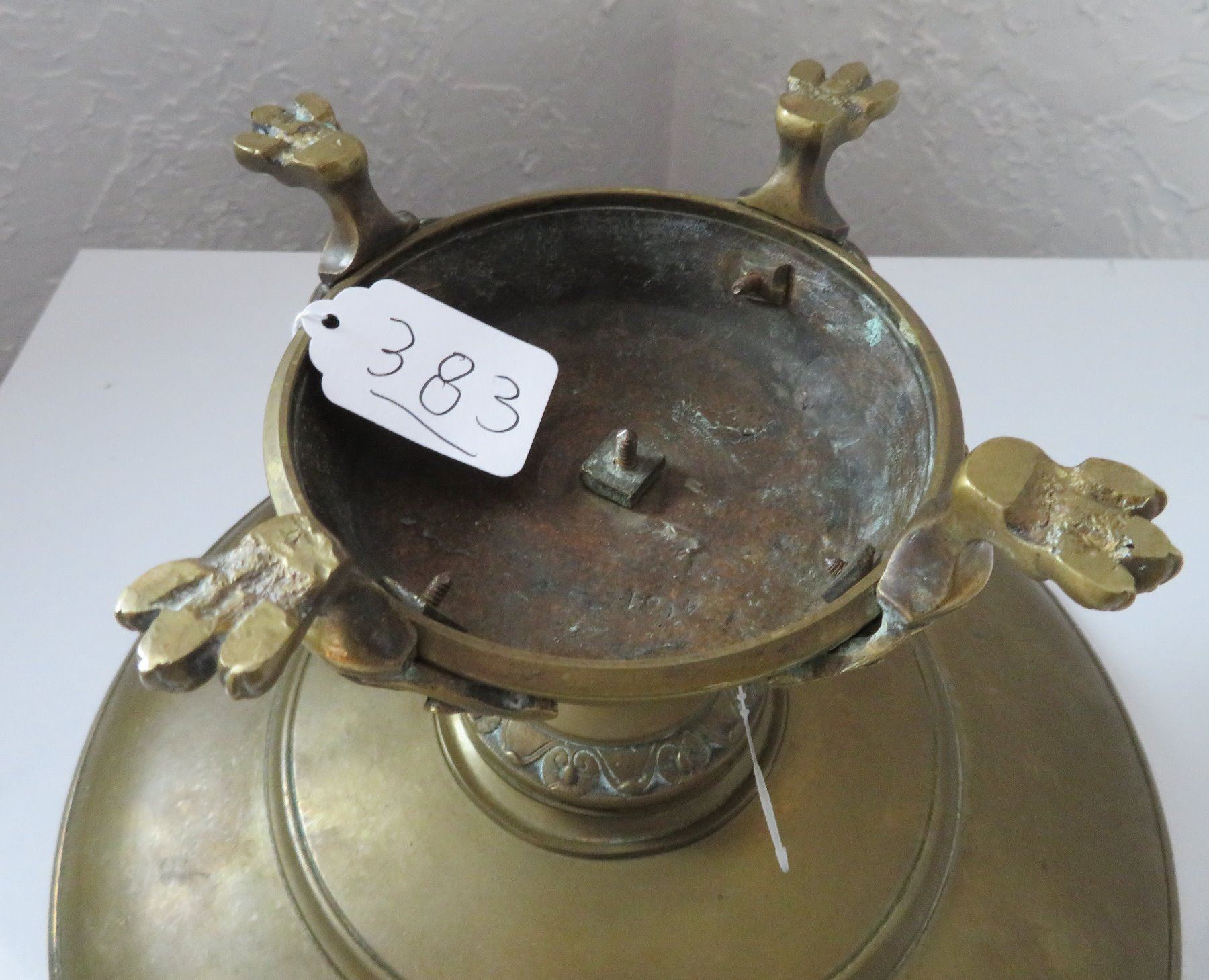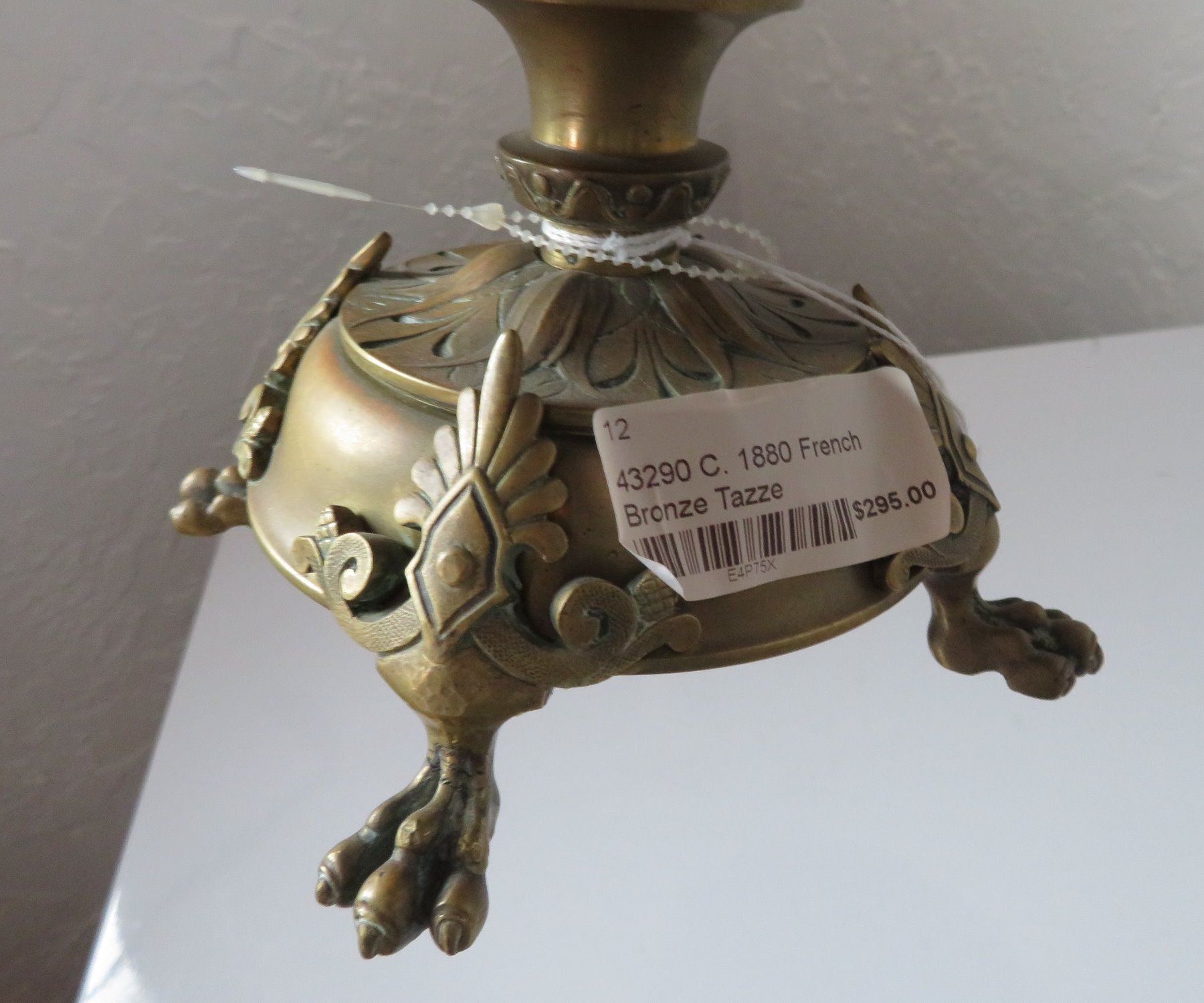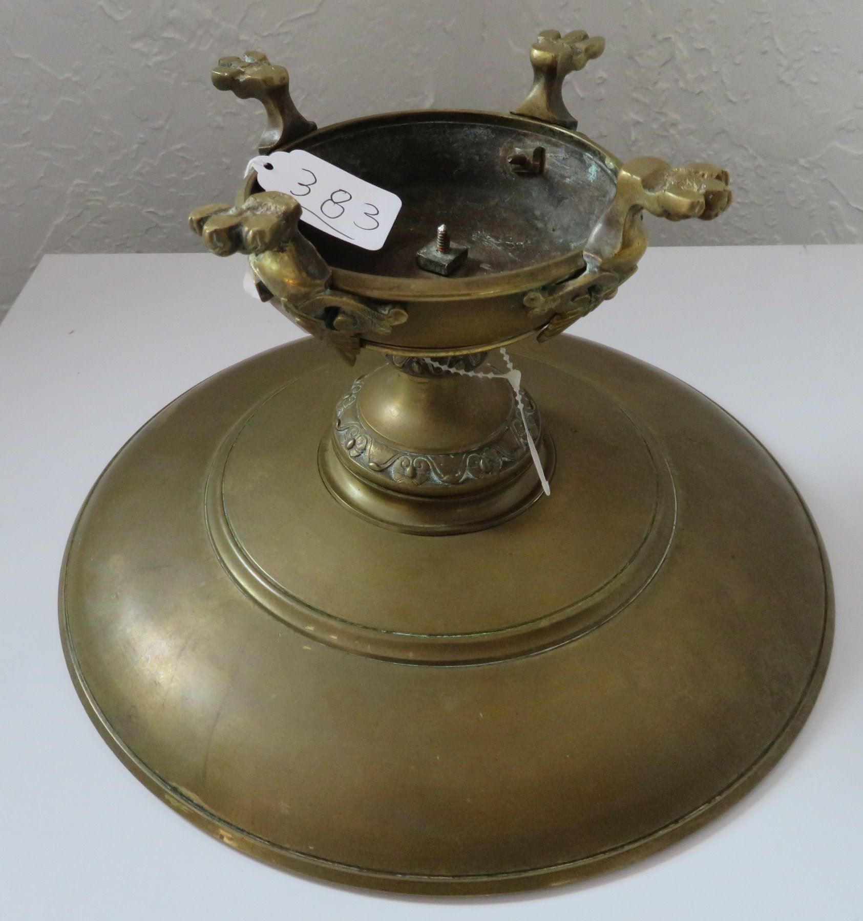 Antique French Bronze Tazza, c. 1880s. Made of bronze, the item measures 10 3/4" wide x 6" tall with a 5" base. French. 1880s bronze shallow, saucer-like dish with stand. Unique design, intricate work on feet. Center portions depicts female human figure. France. Condition: Good, patina, see images. Shipping: $45.00 USA estimate only, w/insurance and signature, due to weight and value.