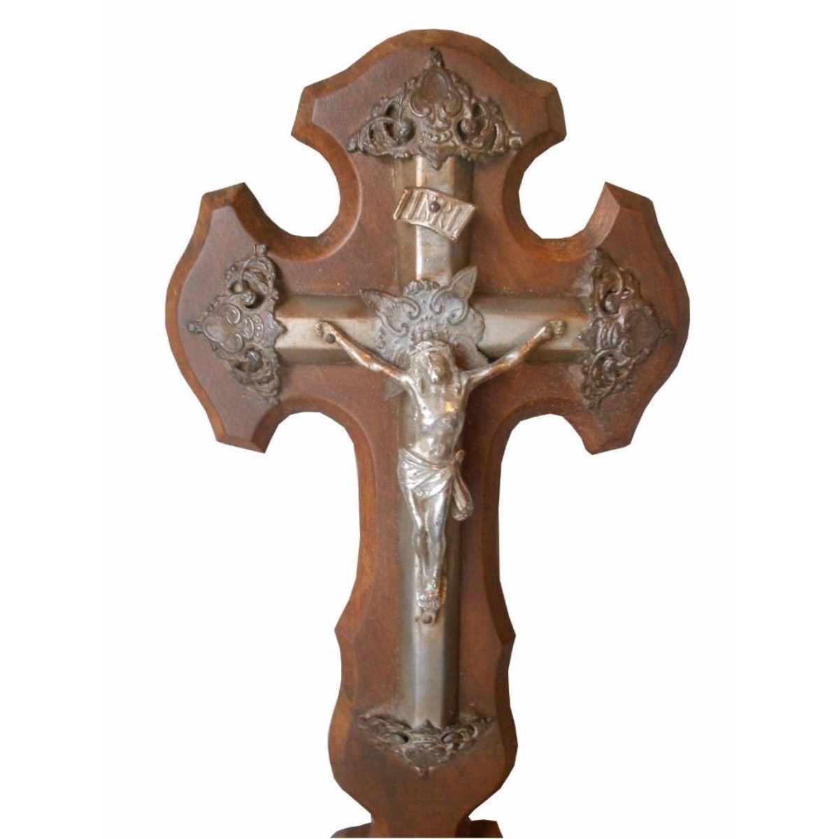 Antique French Wood holy CROSS Panel + CHRIST CRUCIFIX marked INRI made of walnut , Christ and the cross made of metal, GREAT piece, in good used condition, old patina 13.75" tall / 5.50" wide / 2" depth