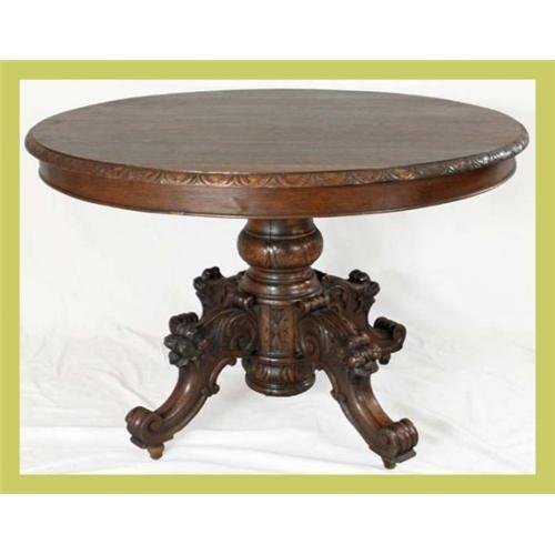 </STRONG>Title: 1890 French Hunting Dining Table Carved</STRONG><P>Item #: 3-415-0</P><P>Comment: This is a great old table! Elaborate carvings on base and along edge make this a special piece!</P><P>Condition: In overall great condition. Wood separation on top and some variation in color due to age. Some dark spots on top due to use. Table leaves not included, although table will accommodate an additional 40 inches of leaves with width of 45.5 inches.</P><P>Dimensions (in.): 29H 46L 40.75W </P><P>Age (ca.): 1890</P><P>Origin: France</P><P>Style: Hunting</P><P>Material: Oak</P><P>Object: Dining Table</P><P>Additional Detail 1: Carved</P><P>Piece Type: Tables</P>This piece is eligible for FREE SHIPPING within the Continental United States. Shipments generally take between 2-10 weeks, depending on shipping company used. Shipments measuring less than (inches) 30 x 47 x 84 and weighing less than 100 lbs per box or item may be shipped via Greyhound Buslines, at the discretion of EuroLux Antiques. Shipments using Greyhound will require the customer to pick up the piece at their nearest Greyhound Bus Station (within 40 miles of customer's home). All shipments include Insurance. Additional assembly, extra packing or crating charges may apply in limited ...