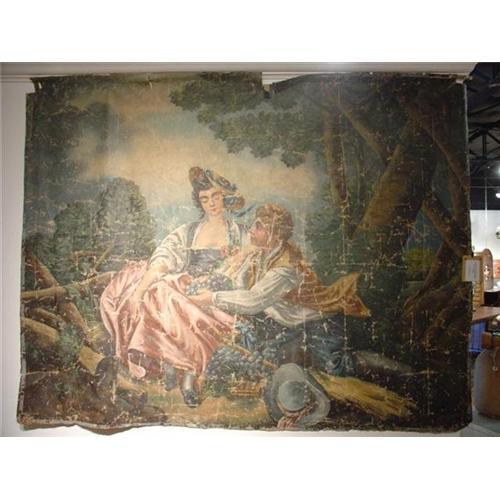 This charming French painting would have been inset into a panel in a boiseried room. The painting depicts a young man offering a basket of fruit to a young woman. The background has trees, foliage and to the right back, a body of water. Though it does require restoration, it is priced far below what another comparable sized painting would be.