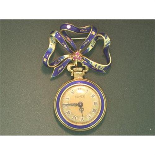 Fine French pin from the Art Nouveau period. Designed in the shape of a bow the center features three fine natural rubies. The pin is 18k yellow gold. From this fine pin hangs a beautiful matching watch. Watch is running and accurate. Case is 18k yellow gold and enamel and has a 15 jewel Swiss movement. Pin and watch weighs 24.3 grams and the pin measures 1.25 inches by 1.00 inch. This antique pin and watch are appraisal priced at $2099.00.