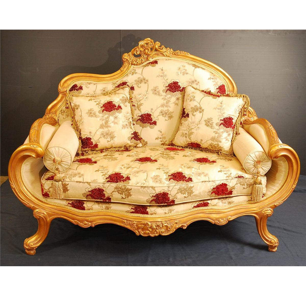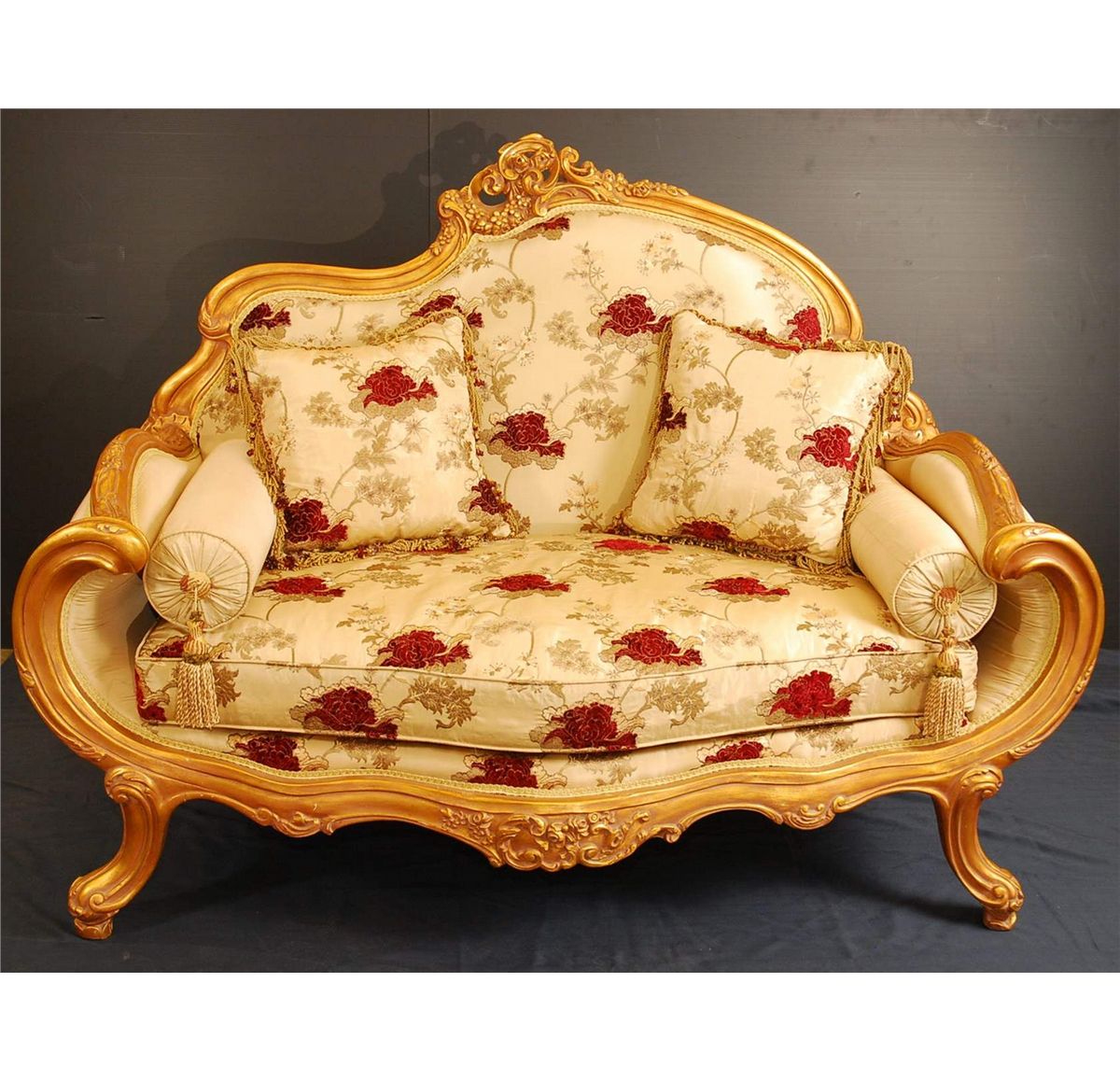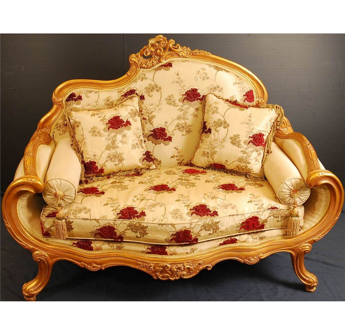 Beige fabric French style sofa with pairs of cylindrical and throw pillows. Embroidered flower design on fabric. Fine curving details on gold leaf wood frame. 45"H x 59" W x 30"D.