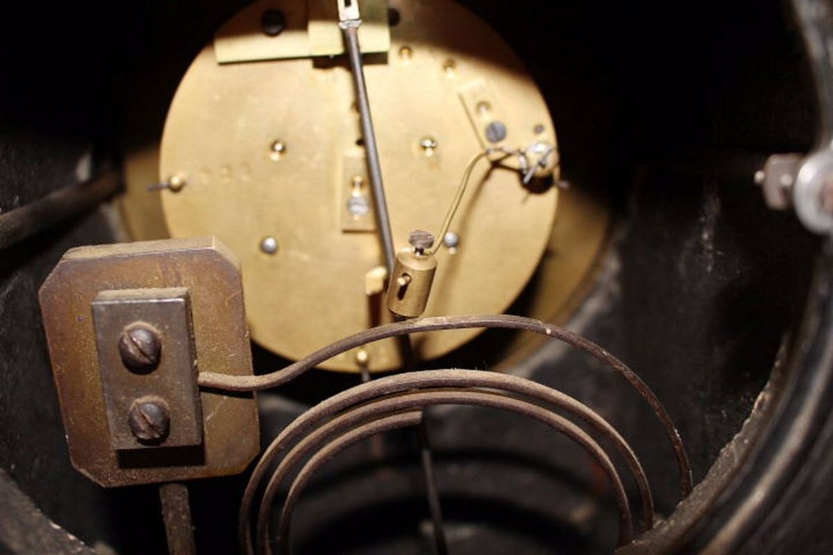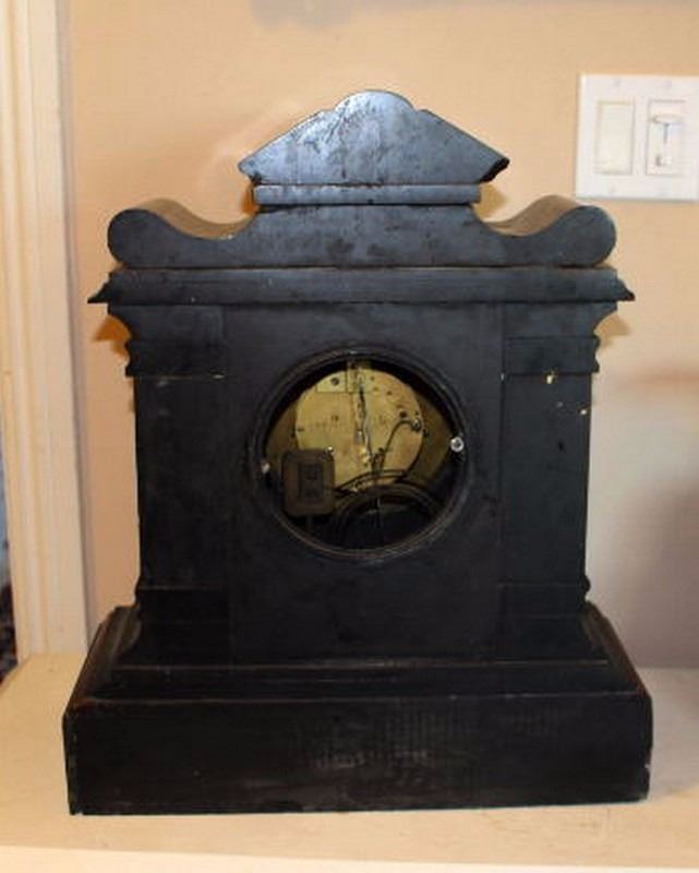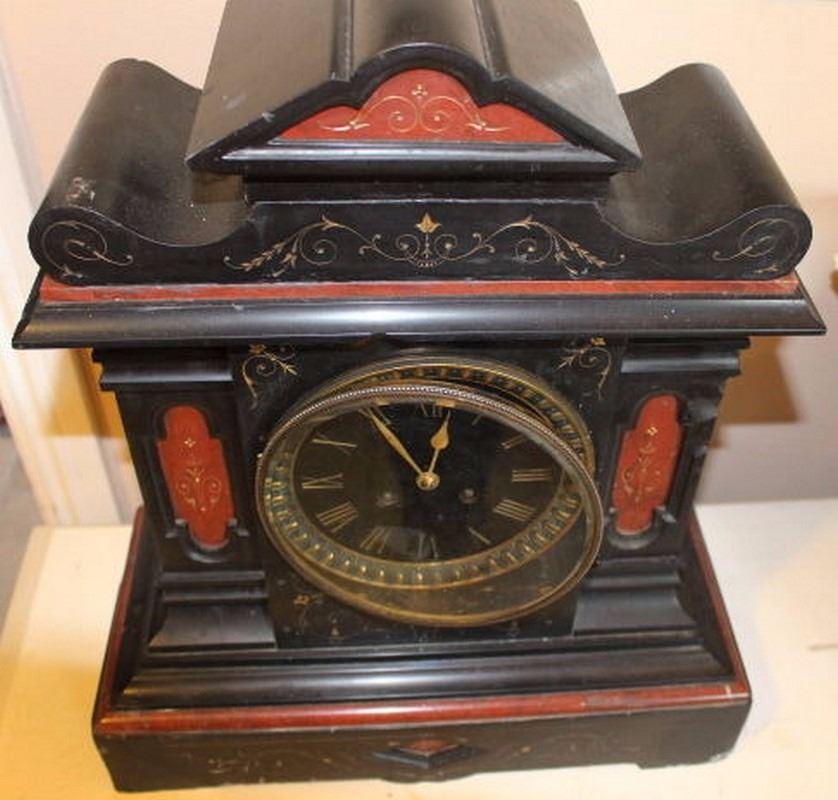 Antique wind-up mantel clocks made with slate are often dark and more rectangular in design. Heavy and rich. Has been revised & serviced by our clock expert and is operational.