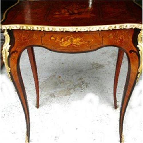 This is a fabulous antique inlaid French, Louis XV style occasional side table in mahogany with elaborate marquetry inlay and exquisite dore' trim and mounts.