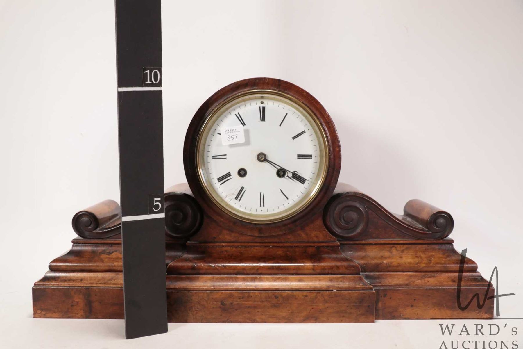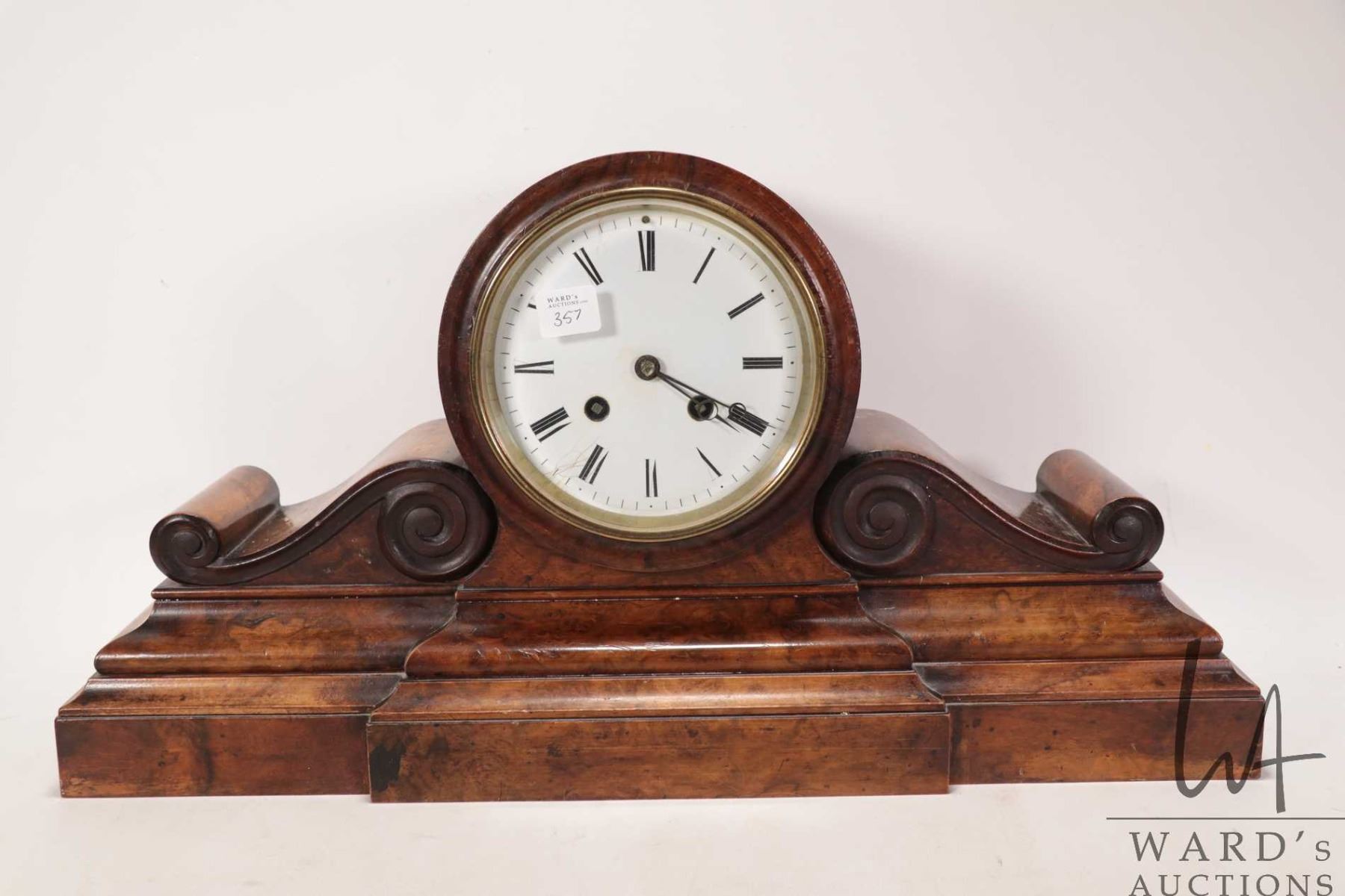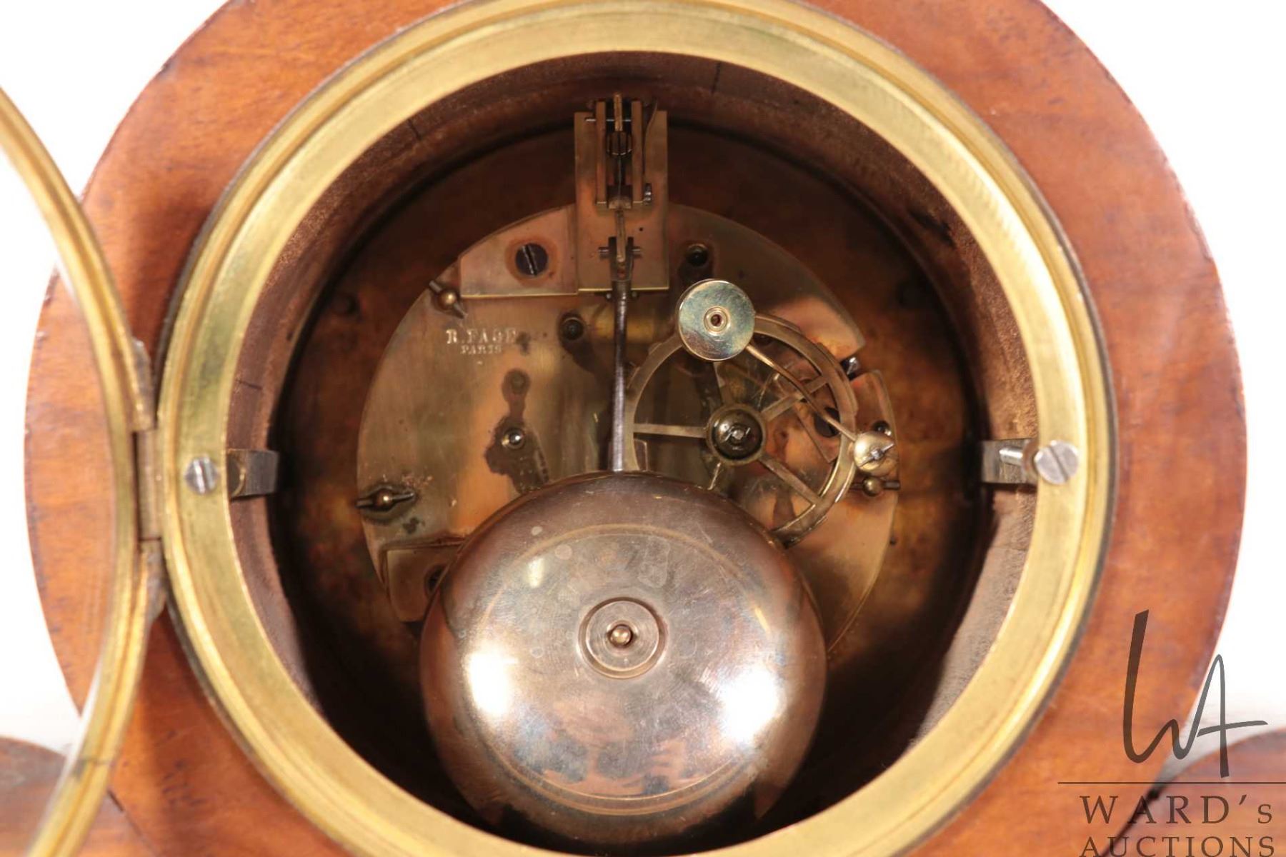 Antique French drum clock in burl walnut case. Working at time of cataloging, however nut missing th