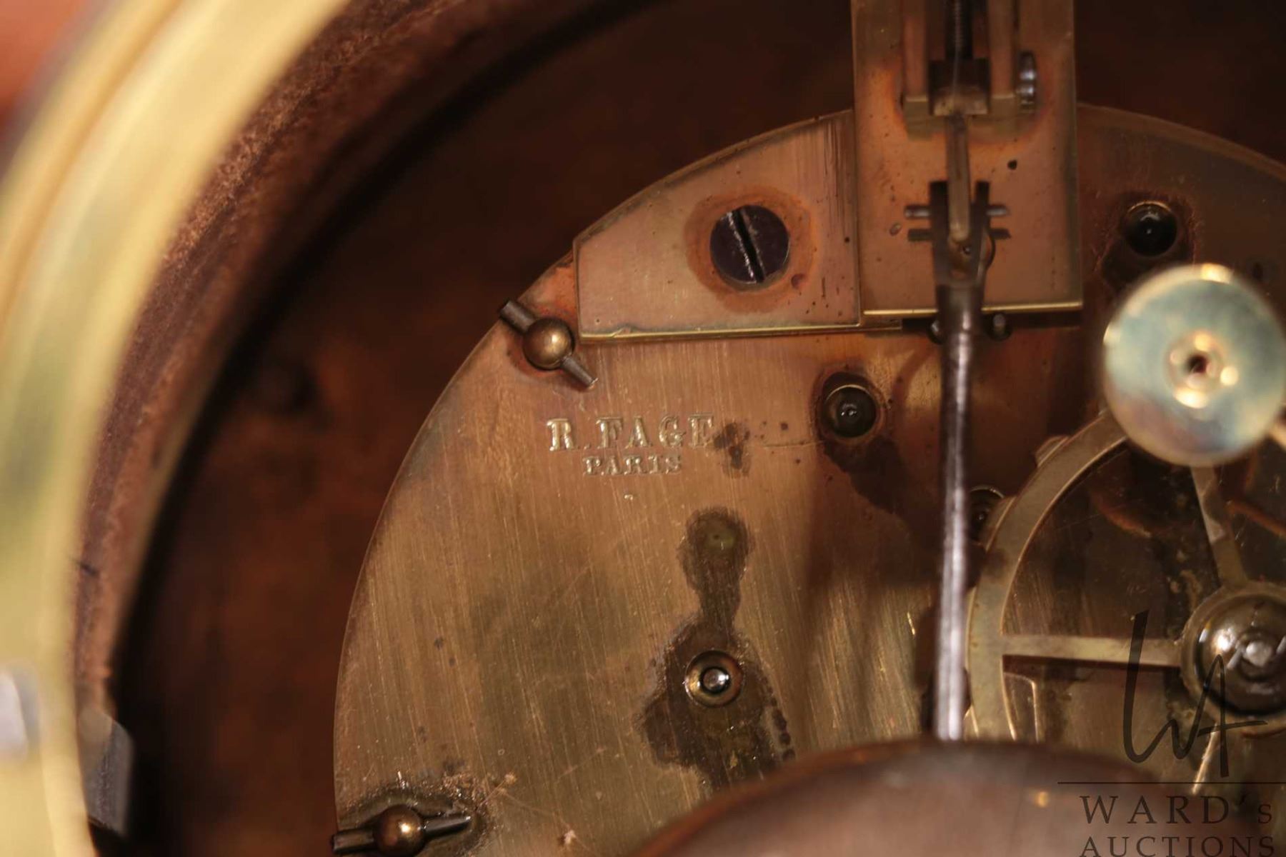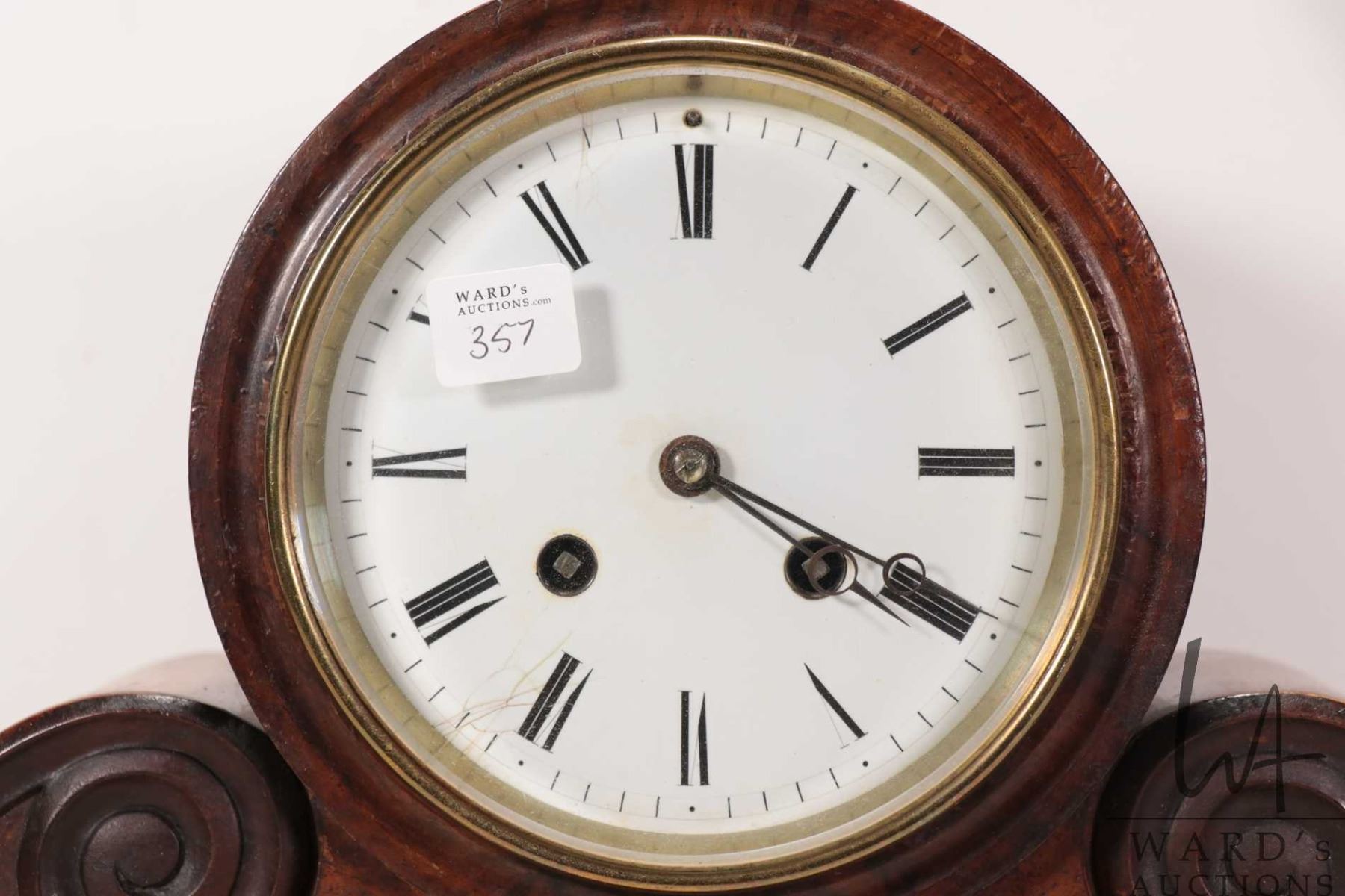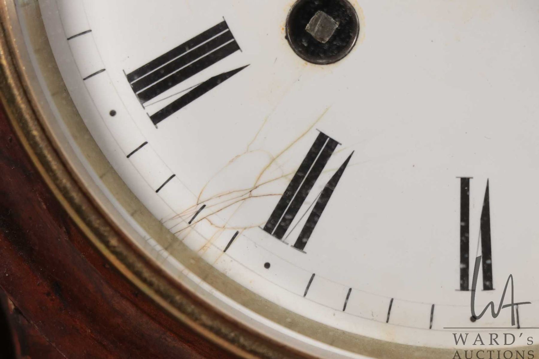 Antique French drum clock in burl walnut case. Working at time of cataloging, however nut missing th