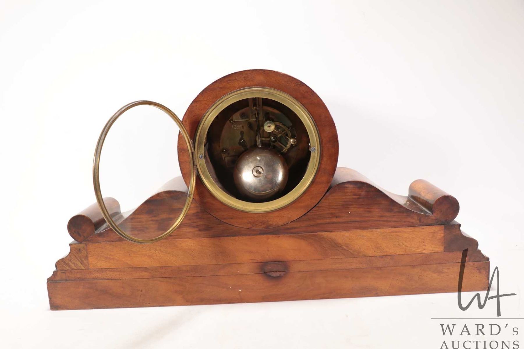 Antique French drum clock in burl walnut case. Working at time of cataloging, however nut missing that holds bell. Note: Not available for shipping. Local pickup only
