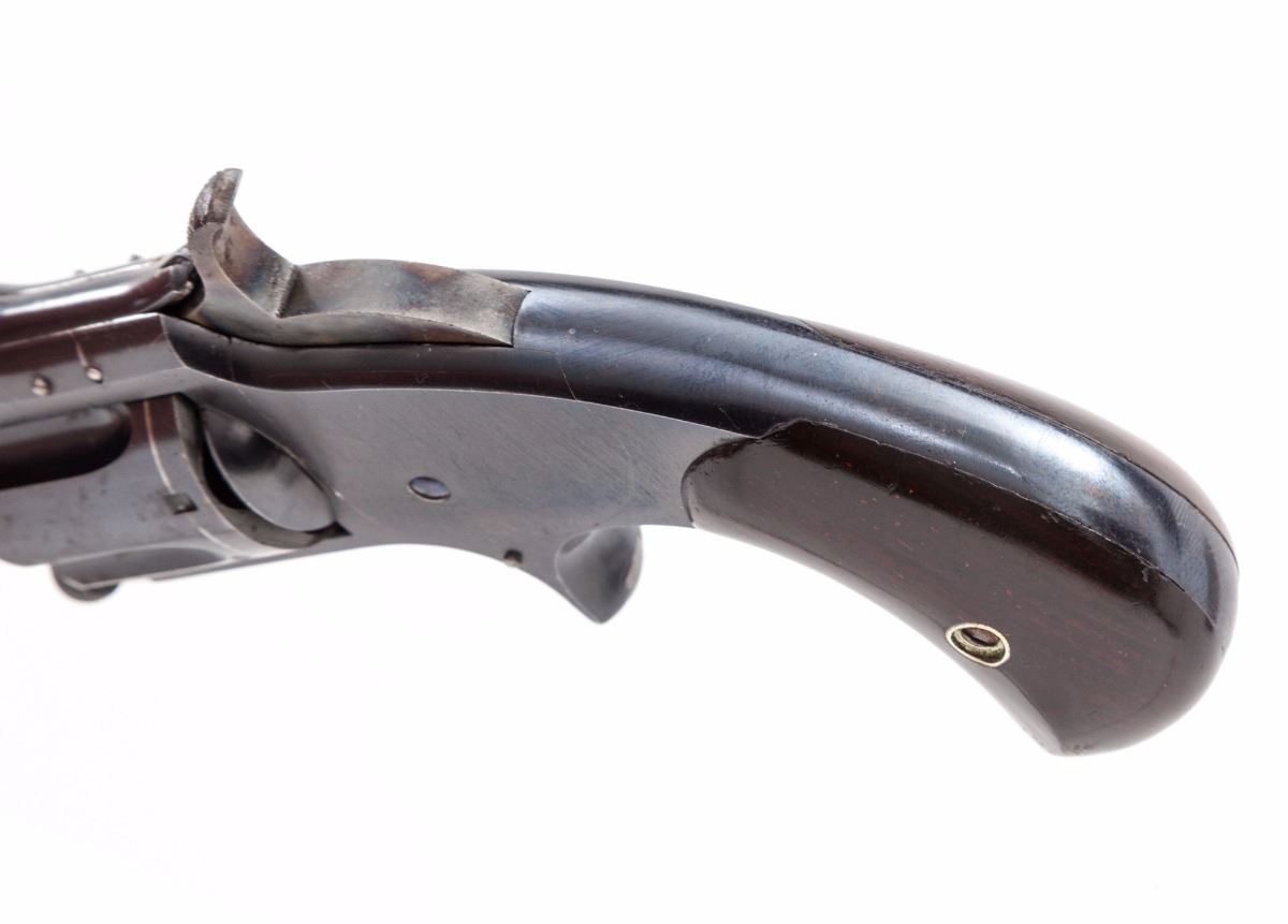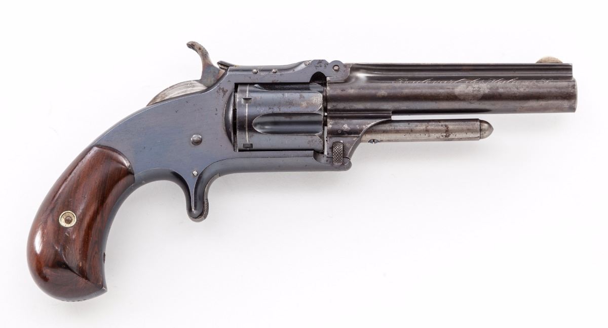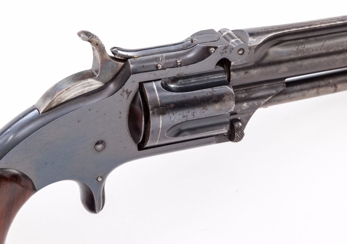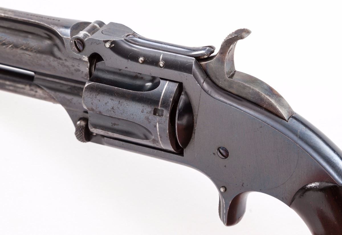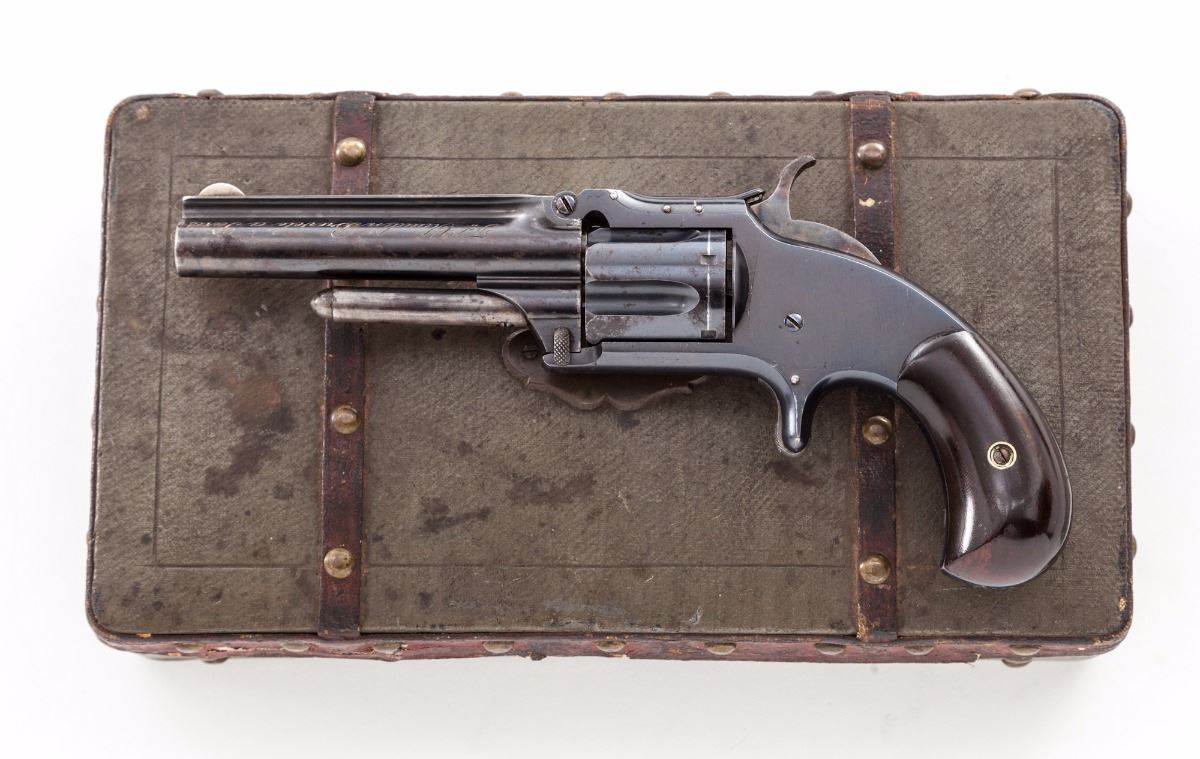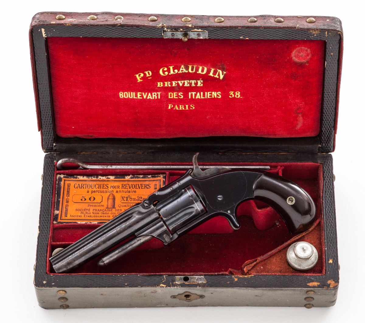 Antique French Retailer marked Smith & Wesson Model 1-1/2 Spurtrigger Revolver, #70277, .32 RF cal., 3-1/2'' barrel marked ''Fd Claudin Brevete a'Paris / Boulevart des Italiens 38'', blue finish, smooth rosewood grips. Red-lined case is similarly marked in gold inside lid. Case includes one empty box of .32 RF by Gevelot & Gaupillat (Paris), one oiler and wiping rod. Ensemble dates from the early 1870s. Condition is fine retaining approx. 85%-90% blue, with most of the thinning to barrel. Grips and action are excellent, bore is fine. Interior of case with minor soiling and sun fading, and some fraying to area occupied by hammerspur. Exterior of case with soiling and minor losses to leather and painted canvas portions. Interesting and seldom seen. Est.: $2,400-$2,800. (Antique)
