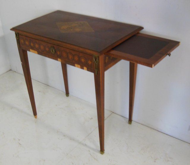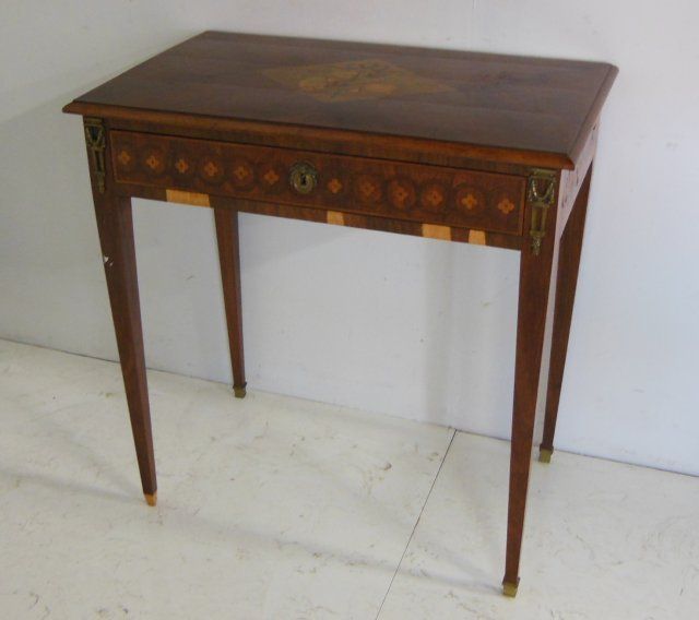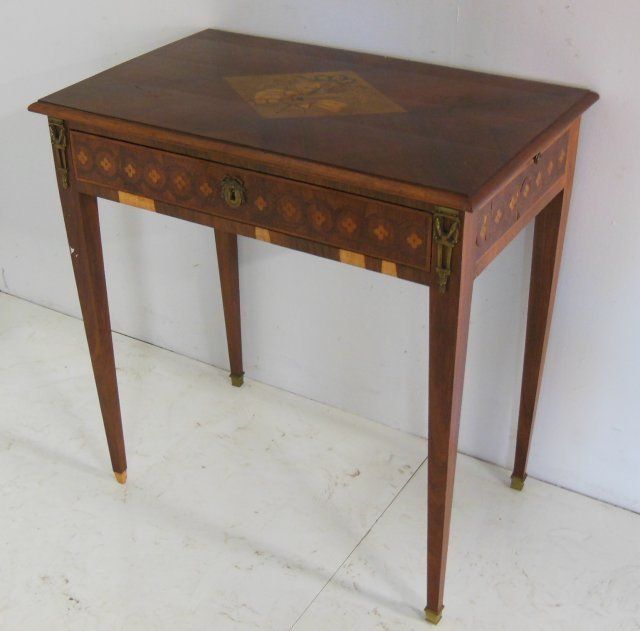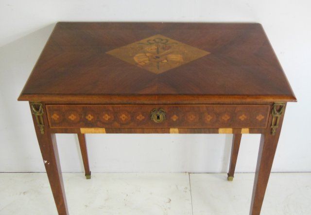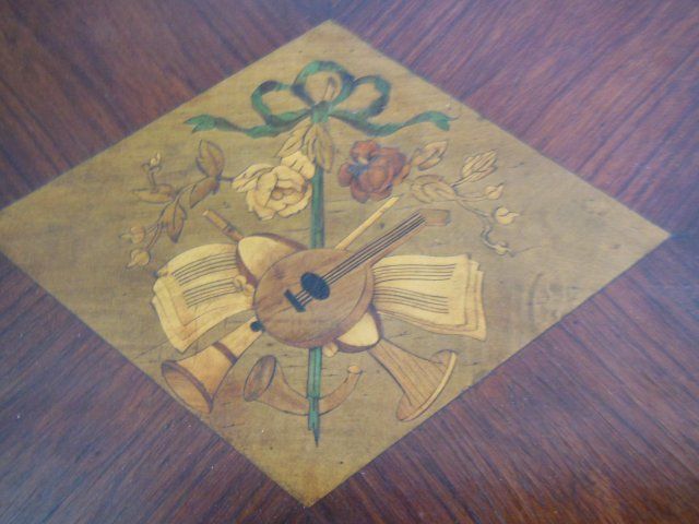 Marquetry inlaid. Approx. 29" H x 27.5" W x 17" D.