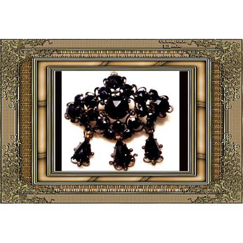 Georgian pieces were not machine manufactured and this is a wonderful period piece that is a great example of how beautiful pieces from that time were. This one has the wire frame and the settings are hand soldered to it. This is black jet or black jet glass. The brooch measures 1 3/4? wide and 1 1/2? high. There is a C clasp and it works great. These are rare so don?t miss out at the last minute.