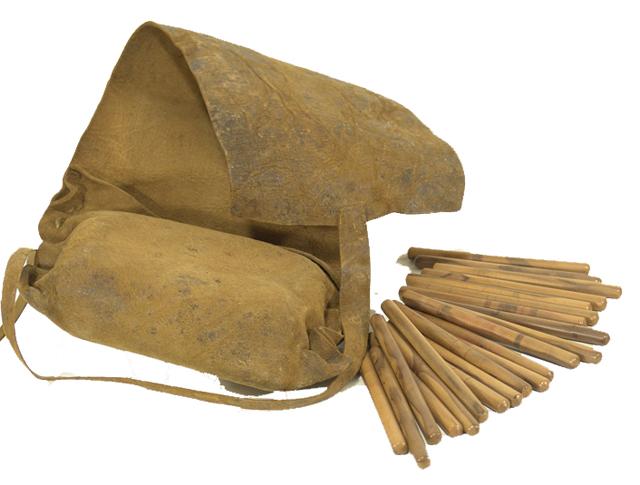 Early/Mid 1900s, Collection of 47 hardwood dowel gaming sticks, several with painted markings - in leather pouch.