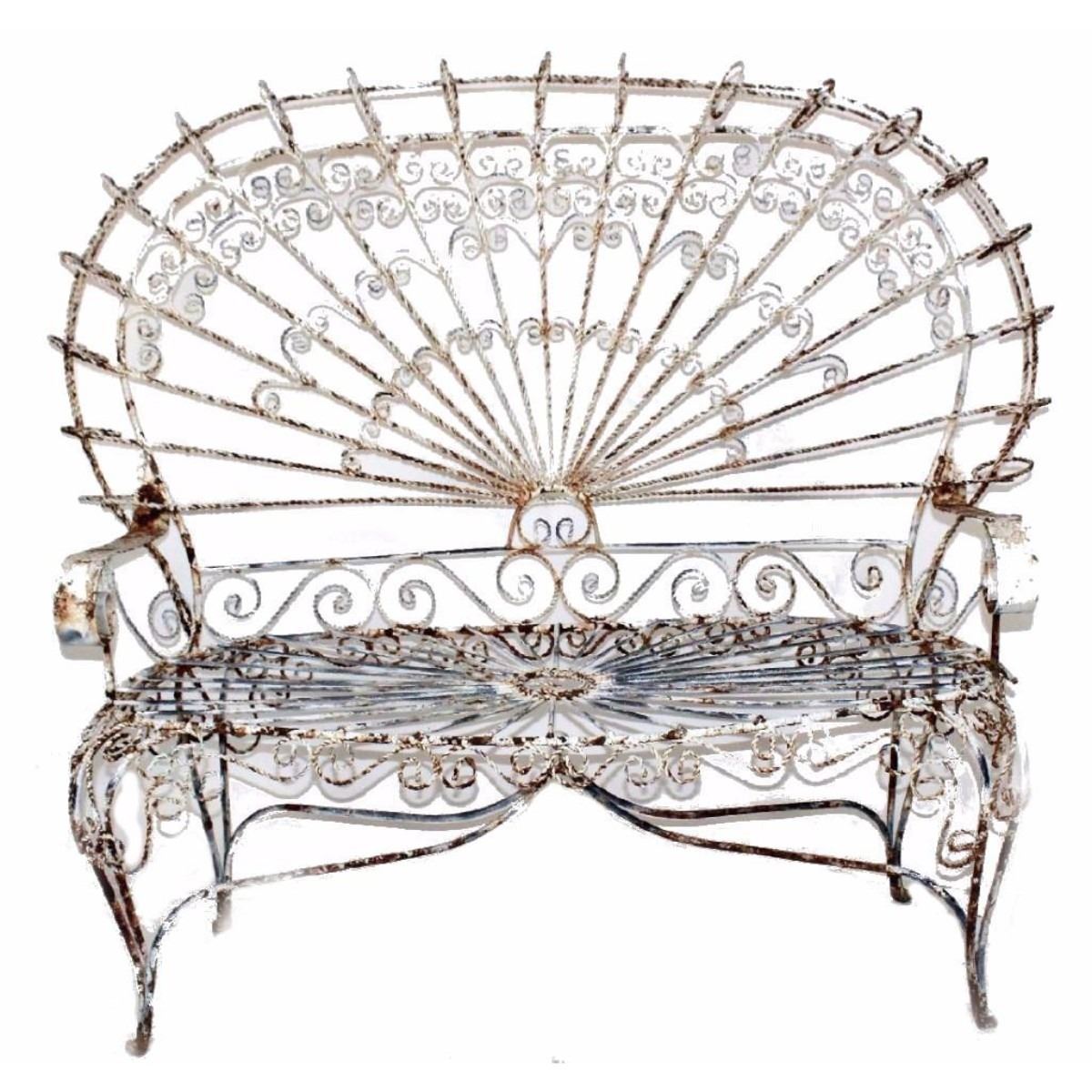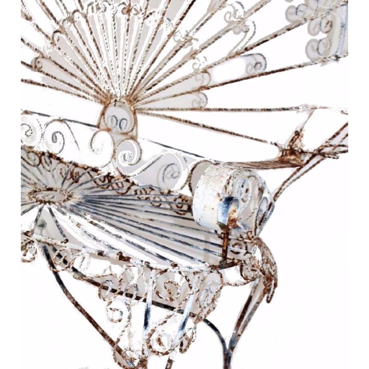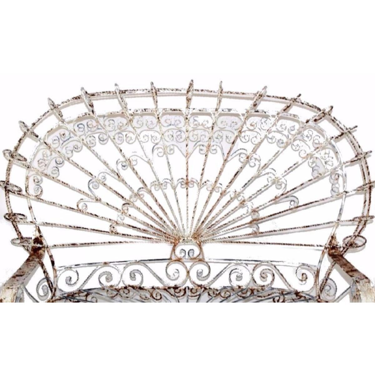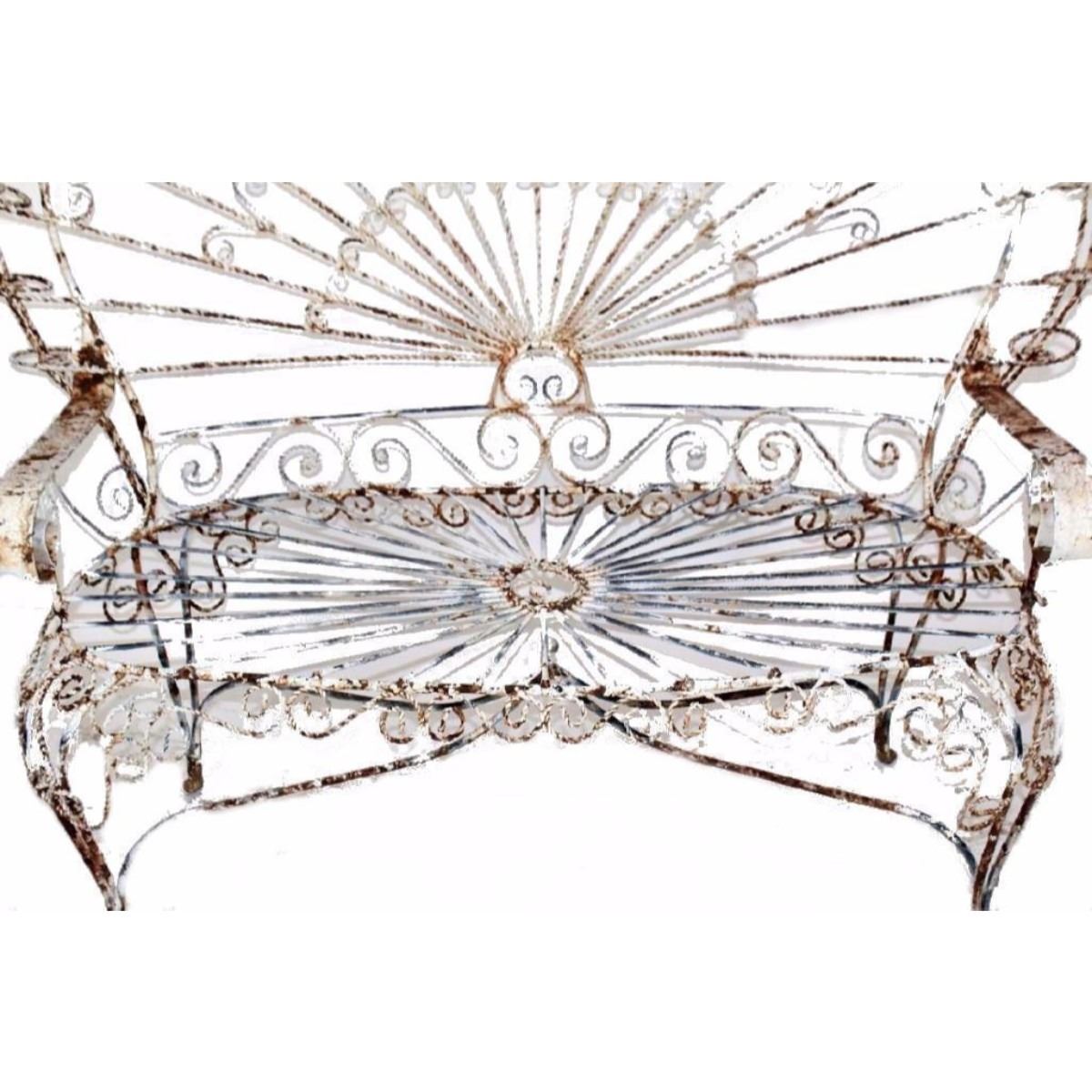 Antique fan-back wire garden bench. Purely a decorative conservatory or garden display piece. Condition as shown in photos. 48"H X 48"W X 20"D.