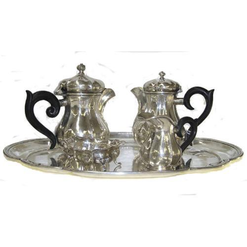This 800 pure silver tea set likely comes from Austria or Germany. Included are a larger and small pot, waste bowl, creamer and tray. Ebonized wooden handles. Marked "800". Tray measures 17.5" by 14". Pots measure 7.5" by 7.5" by 7.5" and 6.5" by 6.5" by 6.5". Creamer measures 4.5" long by 3.6" high and waste bowl measures 4.25" by 3.75". Mark appears to be a lion's mask or bird with spread wings. Total weight of the set is 78 troy ounces.