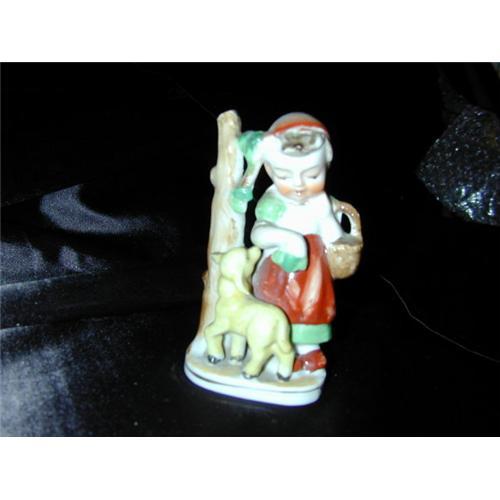 This is a gorgeous figurine of a little girl with a basket on one arm and a hanky(?) in the other with a little yellow lamb nudging her elbow.