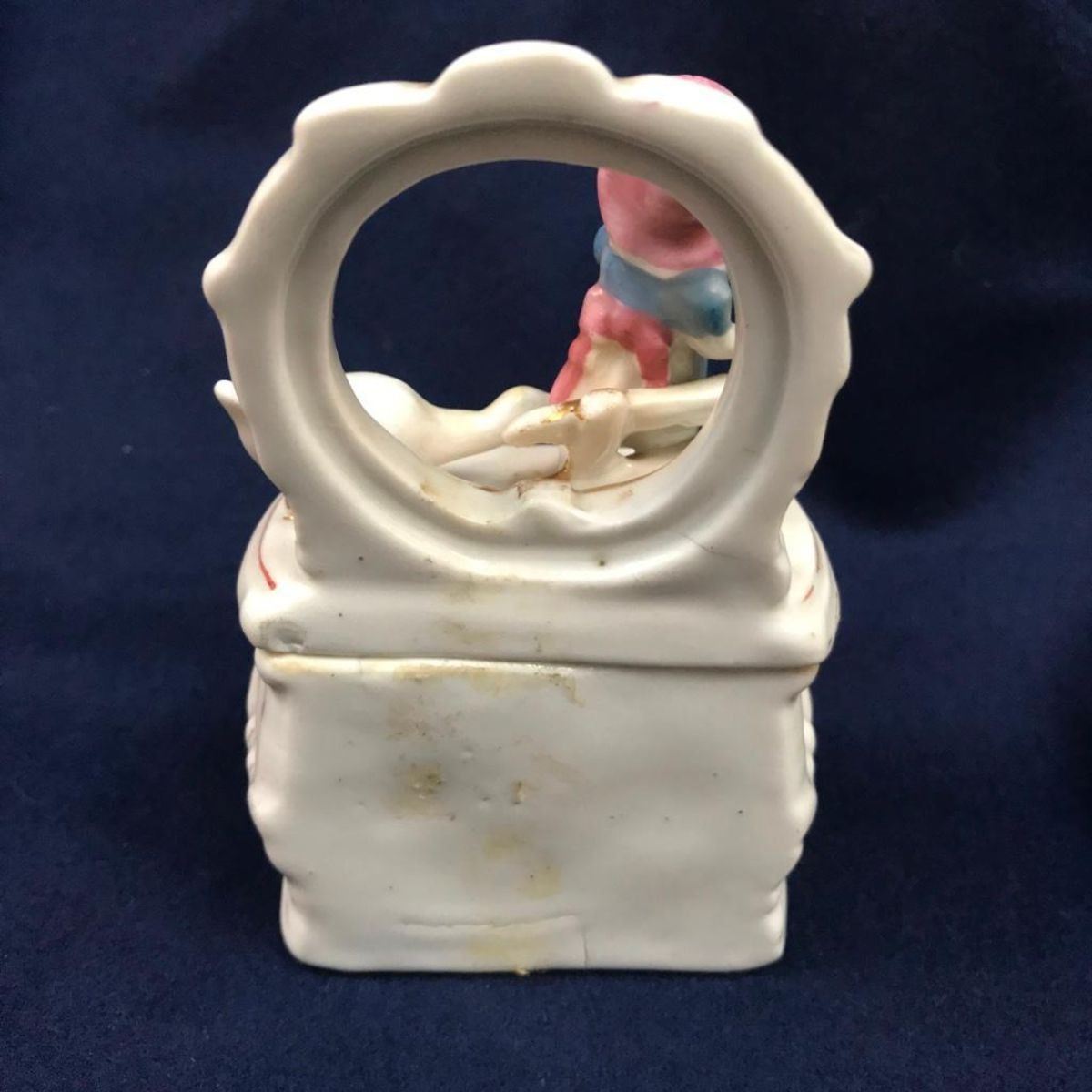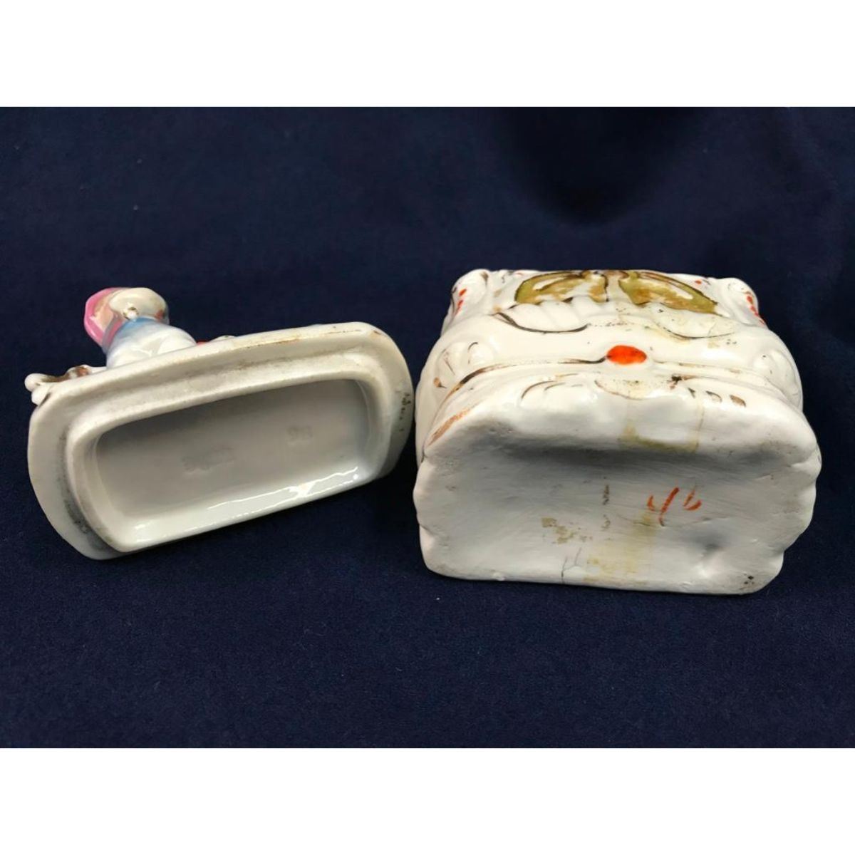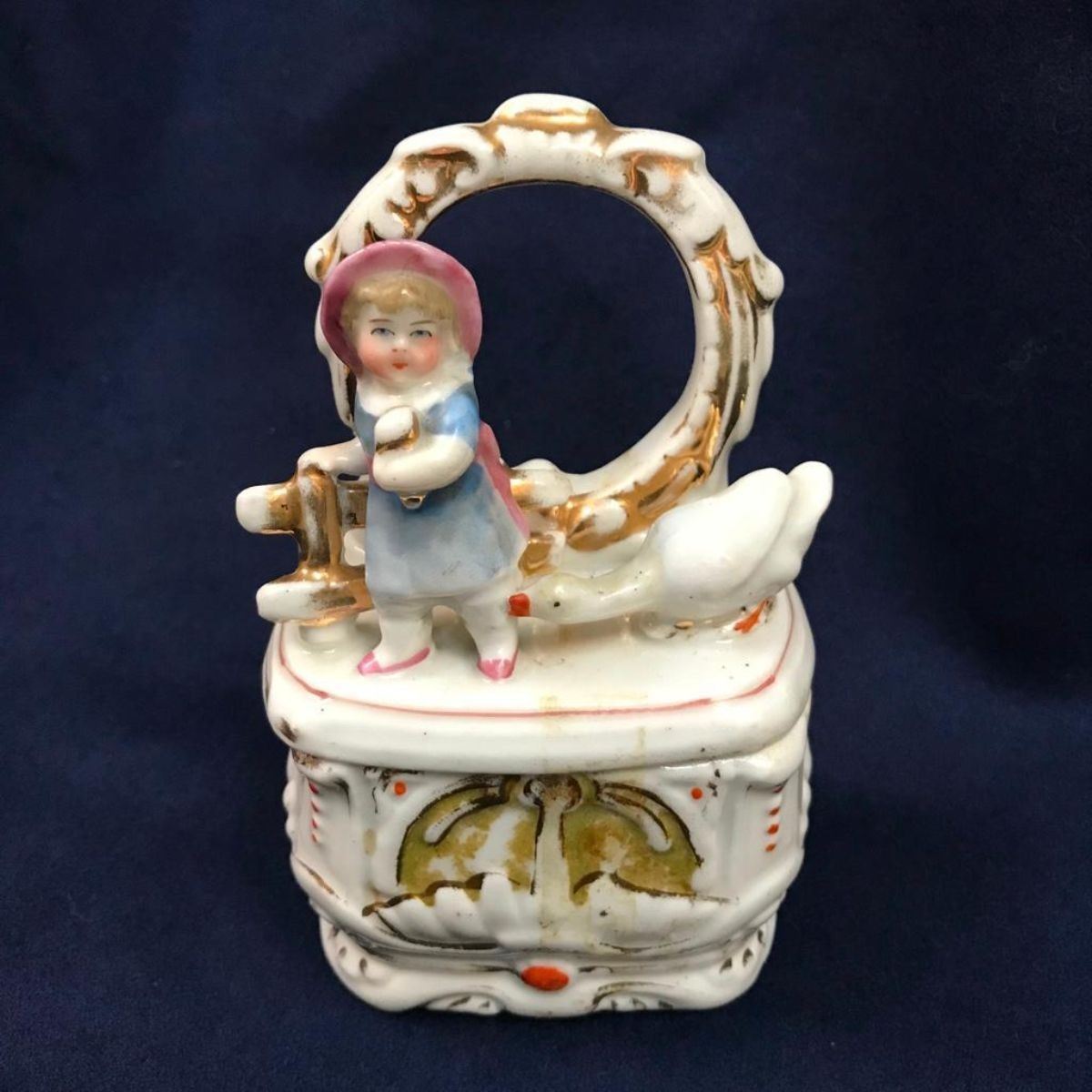 Antique, late 19th-Century Victorian, Conta Boehme German porcelain fairing box, in the form of a goose biting at a little girl. 5" H X 3 1/4" W X 2" D.
