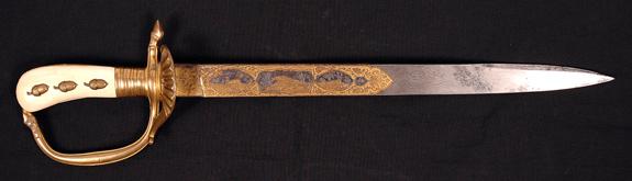 Antique German Forester's Hunting Sword. A very nice example of a German Forester's Sword, circa. late 19th-early 20th century. It has a 14" fine etched, guilded, and blued damascus blade marked W/Soligin Mark, "W. K.&C". Guilded brass guard. Ivory scales on grip (one acorn missing and replaced with a furniture tack). The blade has salt and pepper pitting and retains 80% + gilding and blue.