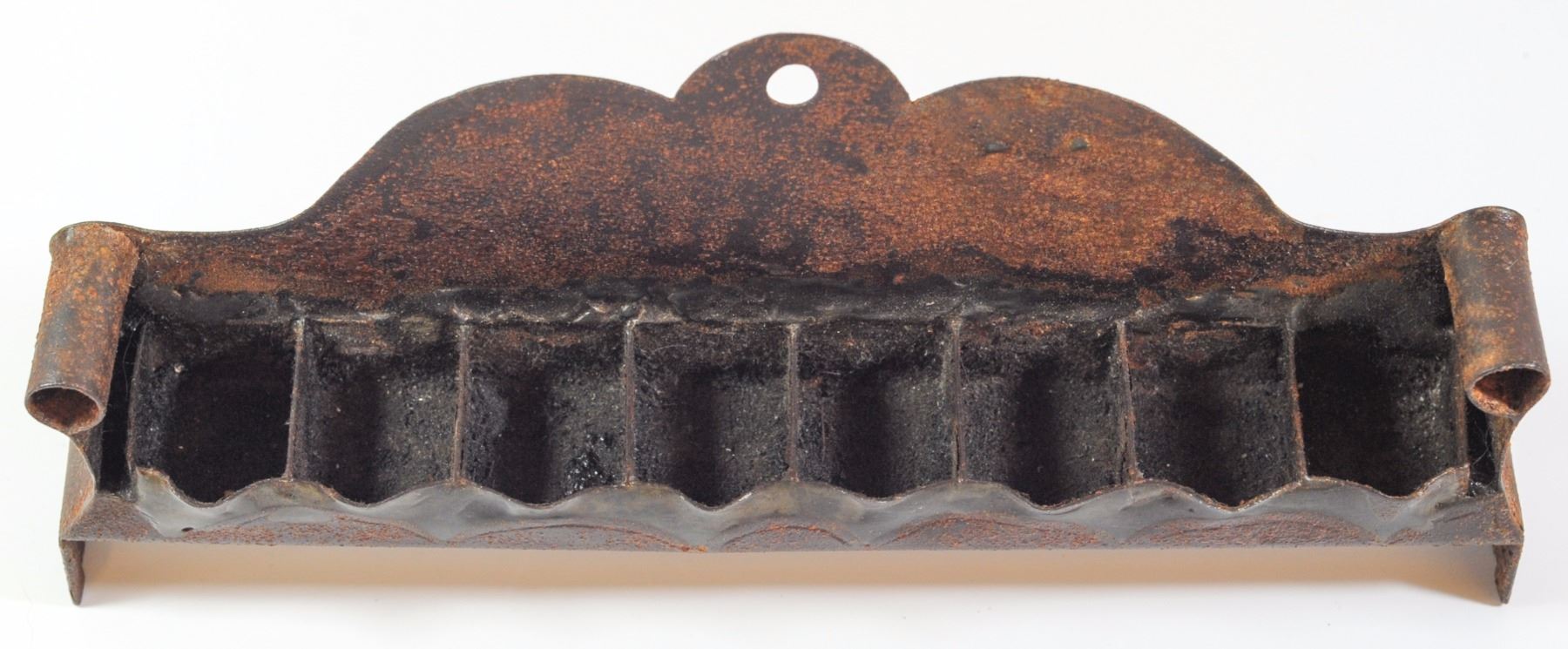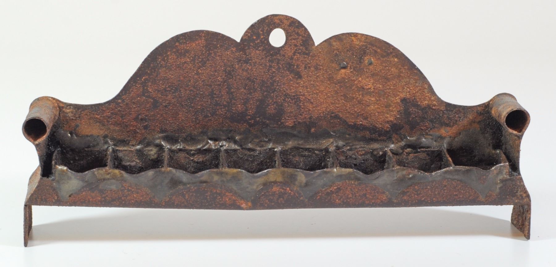 Antique German Hanukkah menorah lamp, presumably made of iron, 19th century, sofa-shaped, for oil candles, reasonably corroded, length: 20 cm, height: 8.5 cm, depth: 3 cm.