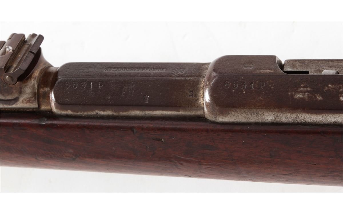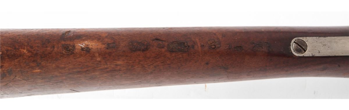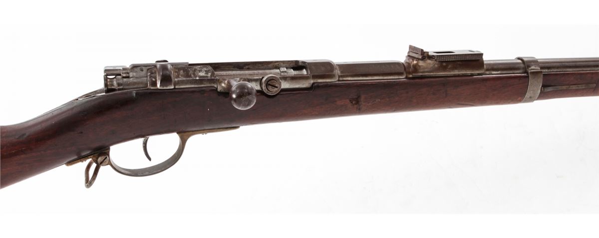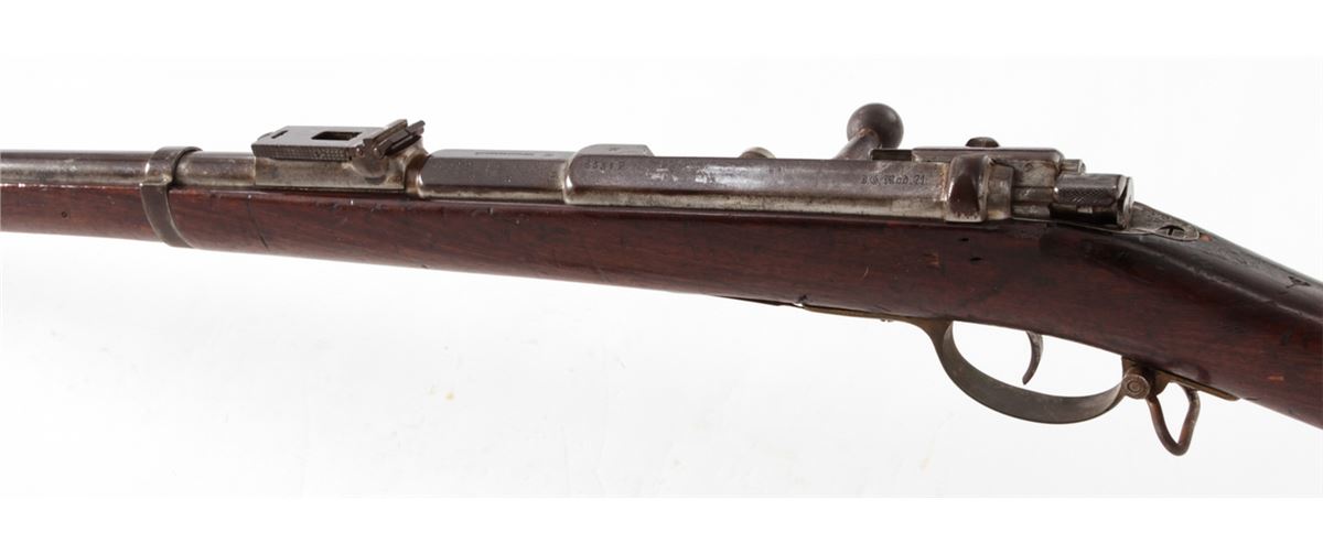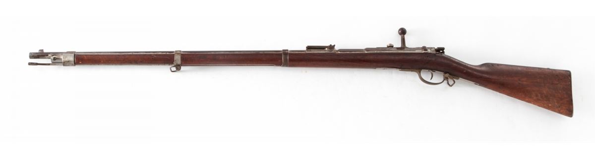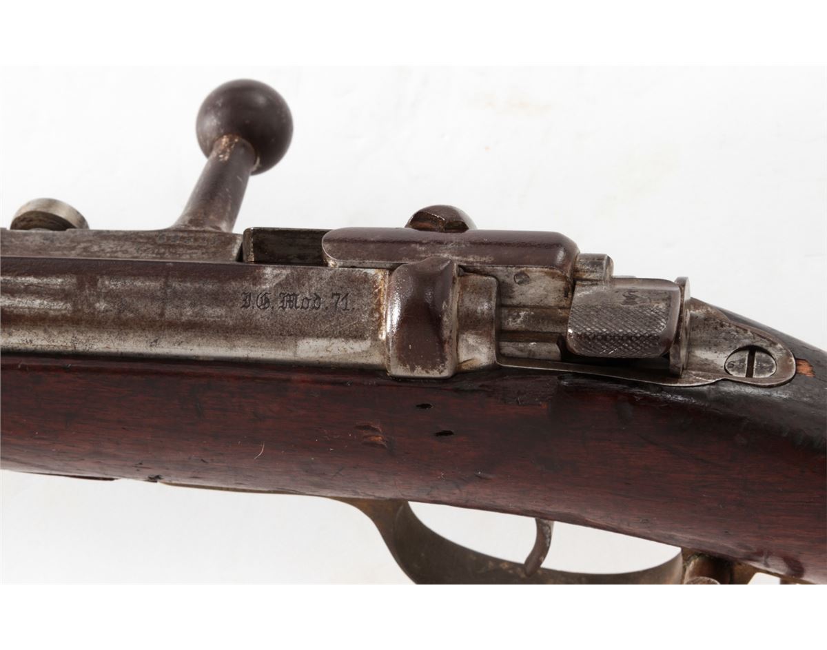 Antique German Model 1871 Bolt Action Rifle, by Oesterr-Waffeb.Ges, #6531P, 11x60R cal., 33-1/2'' barrel, finished in the white, full-length walnut stock, with ramrod. Condition is very good with moderate even overall patination to metal surfaces and matching small parts. Stock with light dings, mars and oil darkening, and cartouches along lower edge behind triggerguard tang. Good action, very good bore. Est.: $500-$750. (Antique)