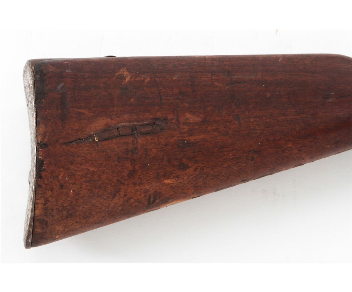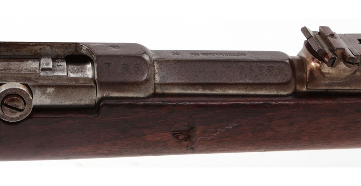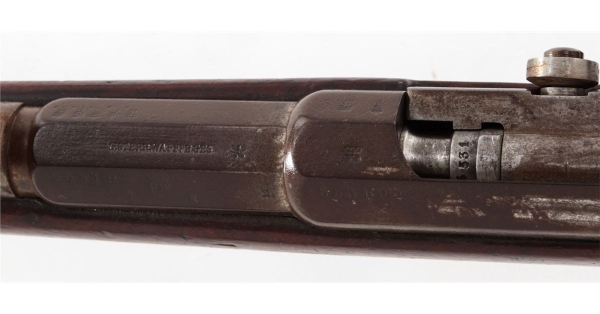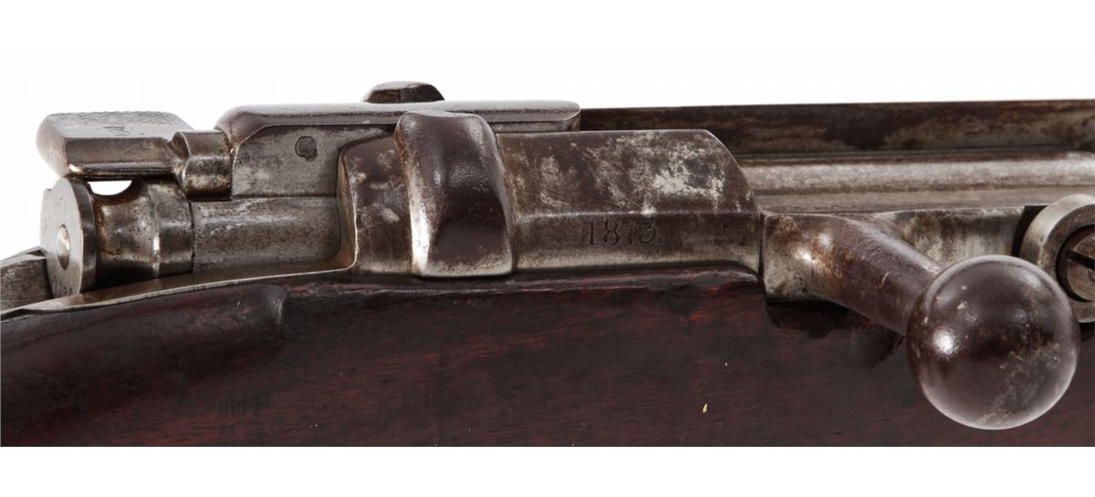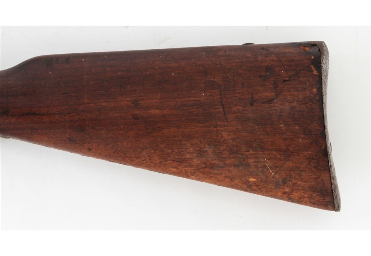 Antique German Model 1871 Bolt Action Rifle, by Oesterr-Waffeb.Ges, #6531P, 11x60R cal., 33-1/2'' barrel, finished in the white, full-length walnut stock, with ramrod. Condition is very good with moderate even overall patination to metal surfaces and matching small parts. Stock with light dings, mars and oil darkening, and cartouches along lower edge behind triggerguard tang. Good action, very good bore. Est.: $500-$750. (Antique)