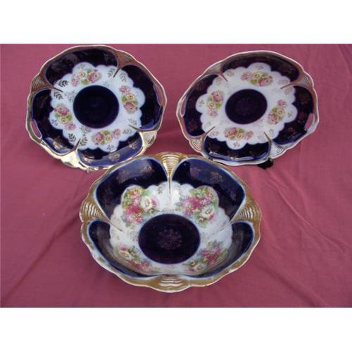 We are pleased to offer this very pretty set from the German Imperial Porcelain Factory at Ilmenau that dates to around 1905. The large bowl and 2 side dishes are decorated with a blue base and have a floral and gilt pattern. The bowl has a slightly scalloped shap and the two side dishes have twin handles. All pieces have the Factory Mark IPF and are offered in perfect condition.