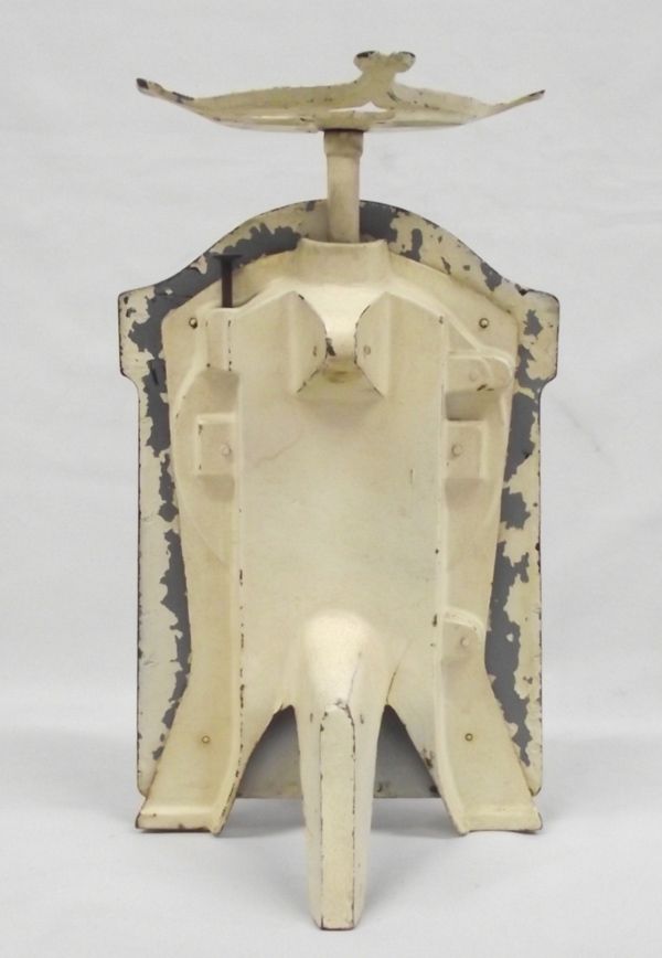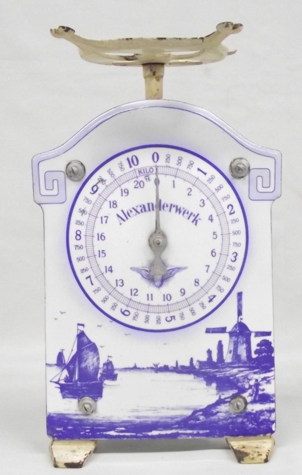 Antique German Scale by Alexanderwerk, early 1900's, kilo scale, face is porcelain on cast iron, cobalt blue picture of windmill in Holland with ships in bay, missing weighing pan, unusual cut out heart pattern on pan holder, measures approx. 12''H x 7''W.