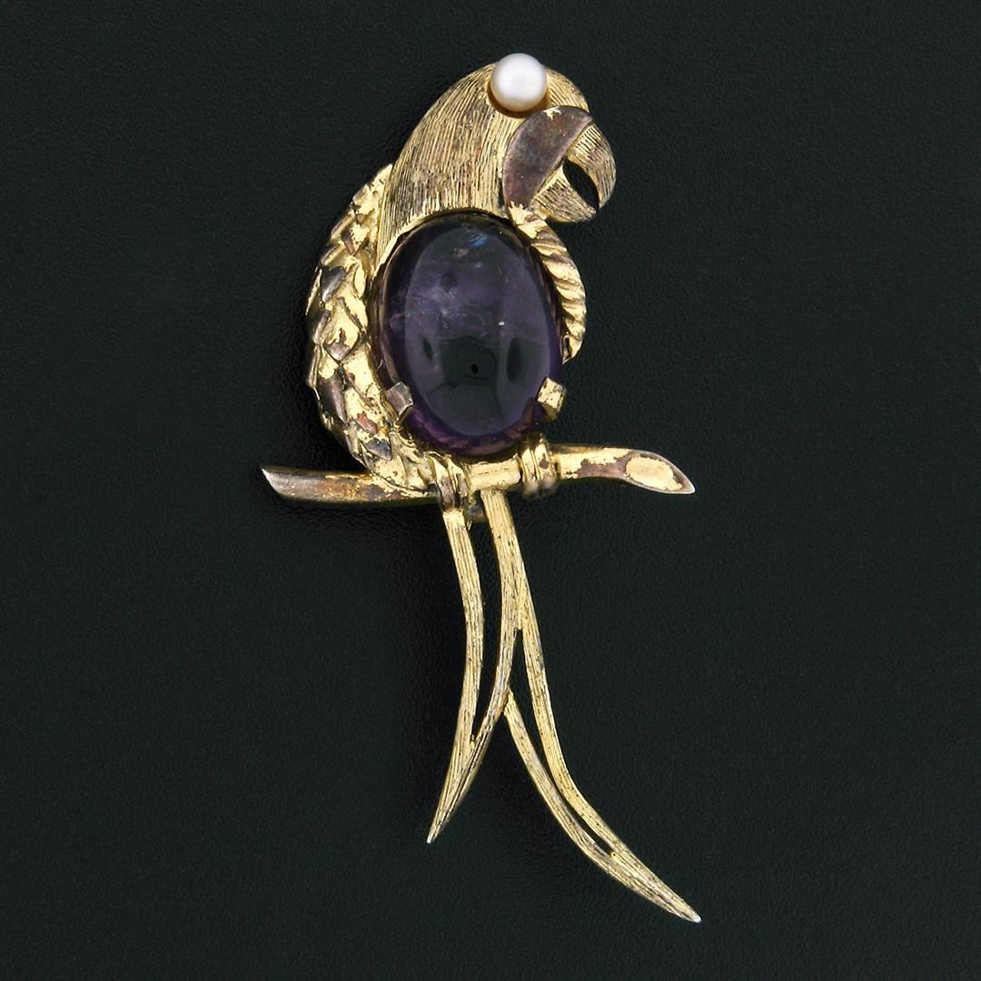 An antique German vermeil silver and yellow gold textured parrot brooch pin with 1 natural amethyst (16.25x12.20mm - 9.08ct) and 1 white cultured pearl (3.65mm). Measures 52.25x33.75mm and weighs a total of 9.13 grams.