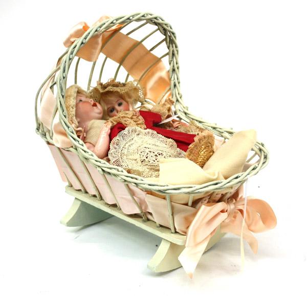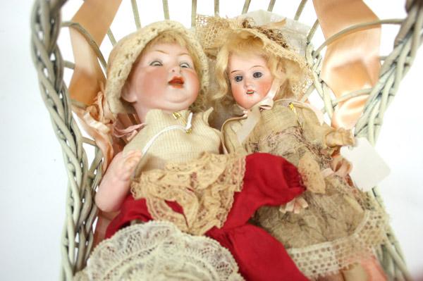 (lot of 3) Antique German dolls including a bisque socket head baby doll with hand decorated facial features, blue sleep eyes, and an open mouth with tongue on a composition body, marked 150, possibly J.D. Kestner, 10''; together with a bisque socket head doll showing hand-decorated facial details, blue set eyes, and an open mouth showing several teeth, marked W & Co., 121, 8.5''; plus a wicker doll basinet