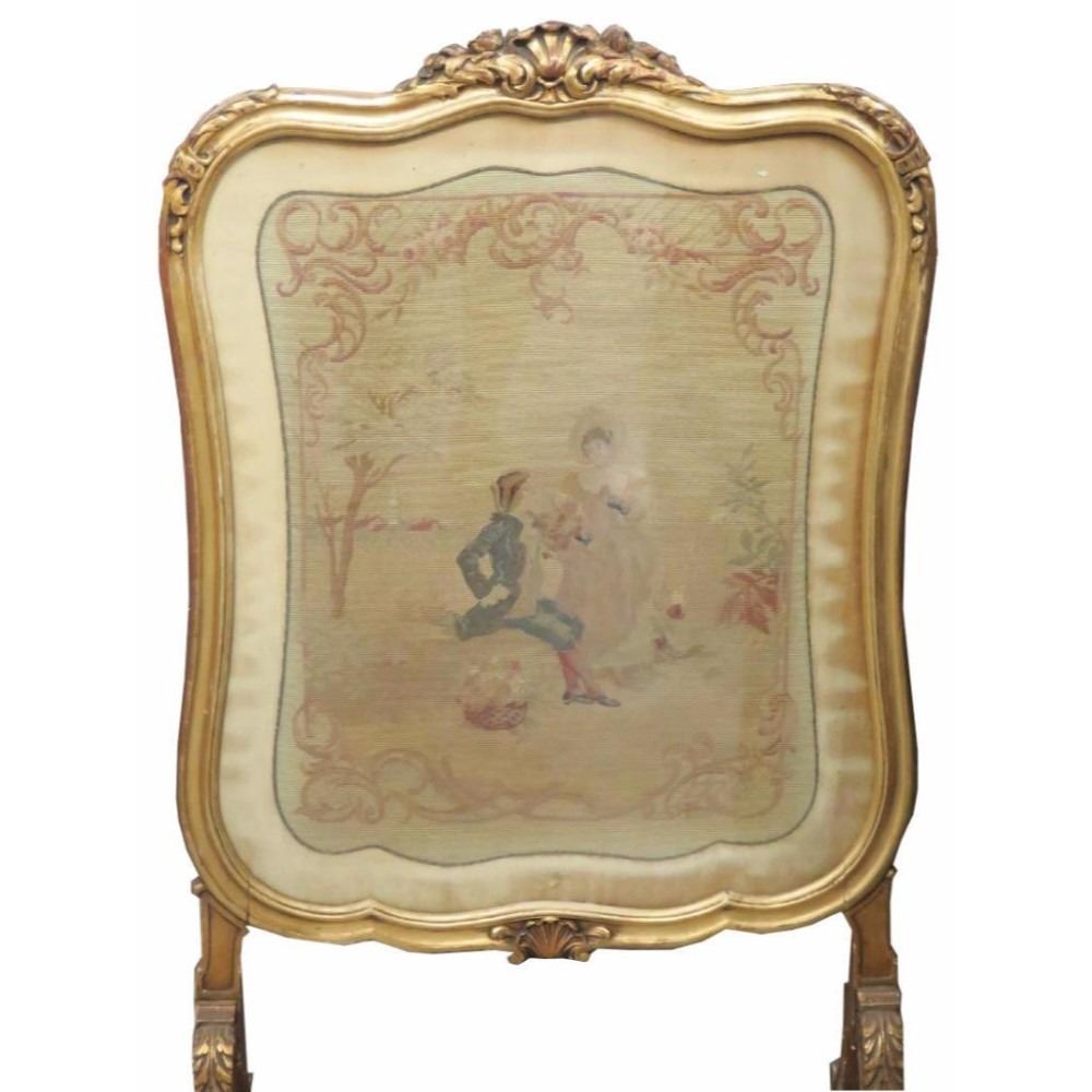 Gilt carved frame with a needlepoint of a courting scene on the front and upholstered back. 46"h. x 27"w.
