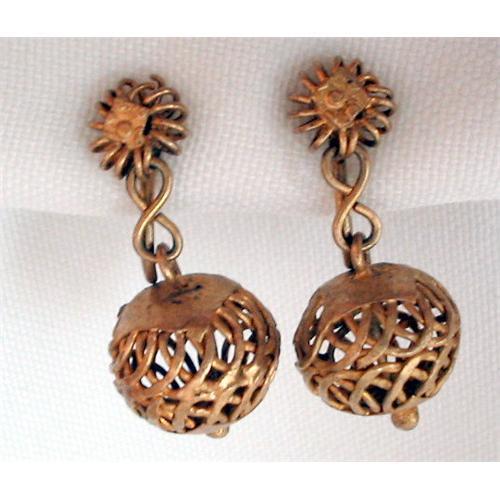 A beautiful pair of early 1900's gilted openwork chandelier drop earrings. The top is comprised of delicately scrolled wirework from which two round filigree style openwork balls dangle. They have the older style screw back close and hang 1-1/4" inches vertically and measure 1/2" inch in diameter. Excellent condition.