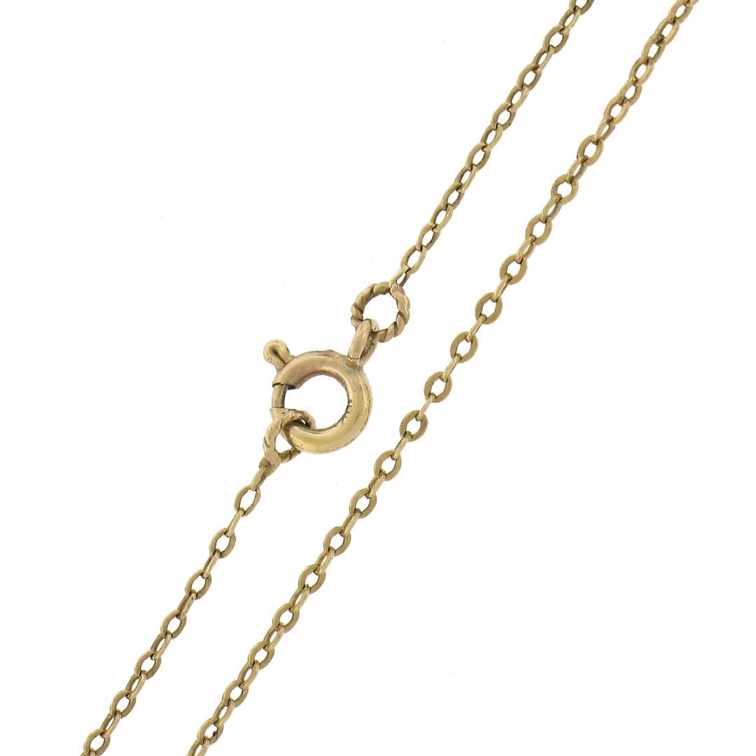 An antique solid 14k yellow gold pendant necklace, with 2 old mine cut natrual diamonds (H/I - VS2/SI1 ; 0.14ctw). 16.5 inch cable link chain, 2.18 grams total weight, pendant measures 29.2x12.7mm.