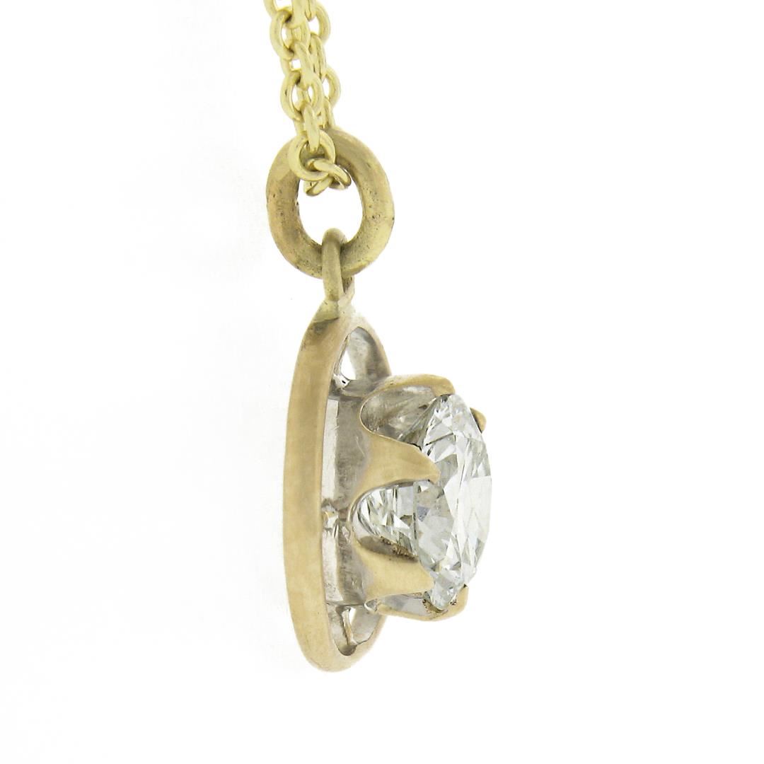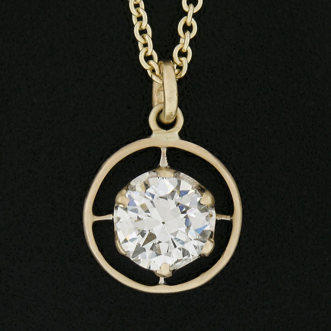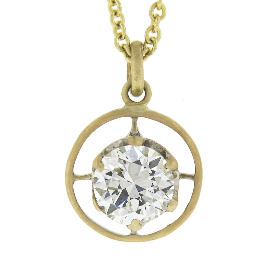 An antique solid 14k yellow gold pendant necklace, with 1 GIA round cut natural diamond (E - VS2 ; 0.69ct ). 18 inch cable link chain, 3.22 grams total weight, pendant measures 13.6x9.8mm. Comes with all original relevant certifications.
