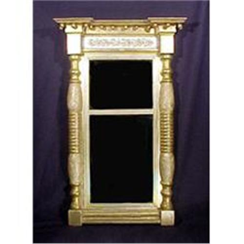 Spectacular federal period mirror. It is made of carved wood, gesso and gold gilt with a very nice inset panel with a white background having carved and applied acorn and leaves. It is a two part mirror. It is in very good condition ? just as I found it and just the way you like to see them. The gilding is water and oil ? a combination of both. Dating from the late 1700?s into the very early 1800?s. It is in a very nice state of preservation down to the federal balls that decorate the top crest of the mirror. The mirrors are in very good condition. Not sure if they are original or not although they appear to be. It measures 20? at widest x 3 ¾? at deepest x 31 ¼? at highest.