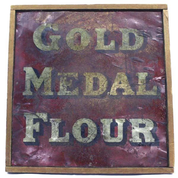 Antique Gold Medal Flour Tin Sign in Wood Frame, visual measures 15'' x 16''