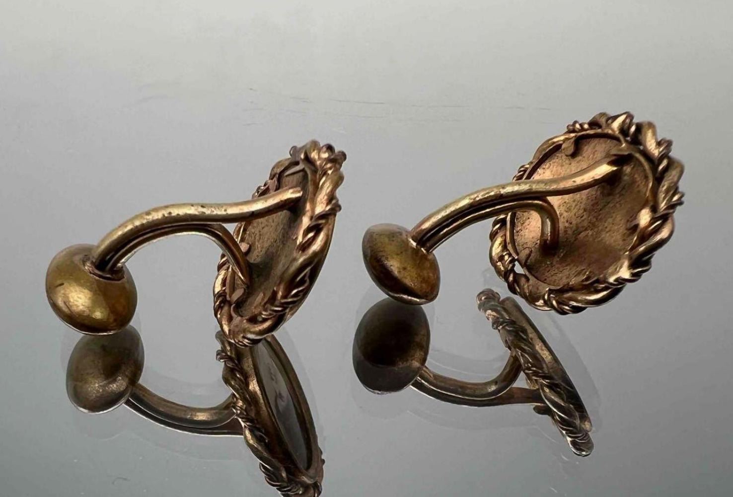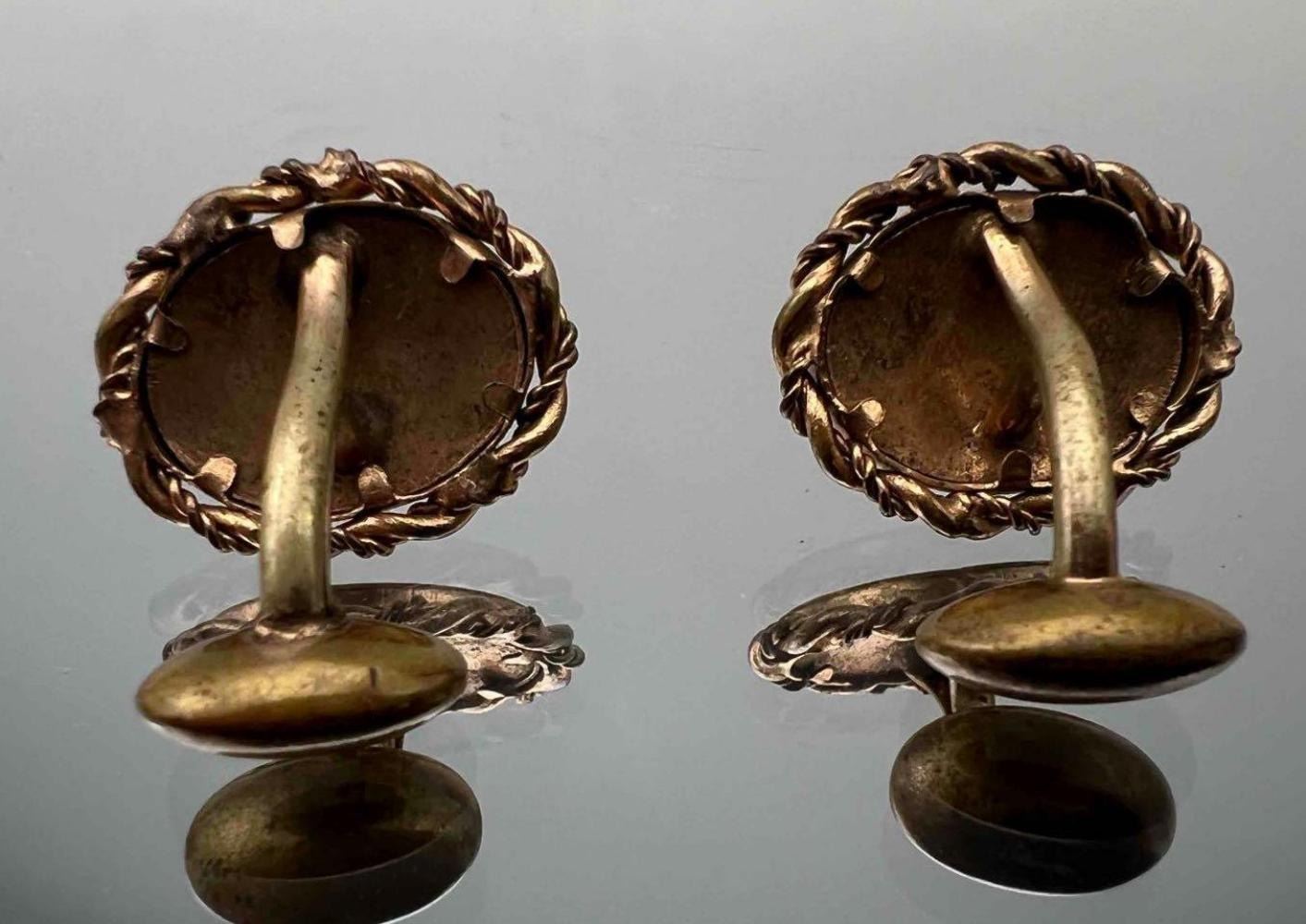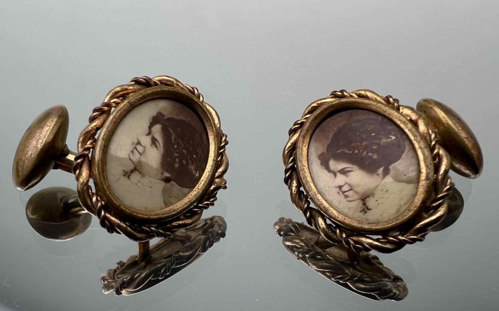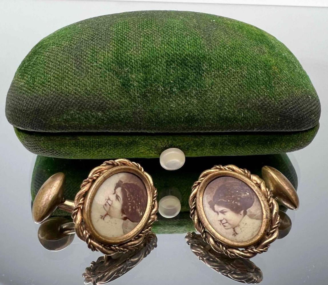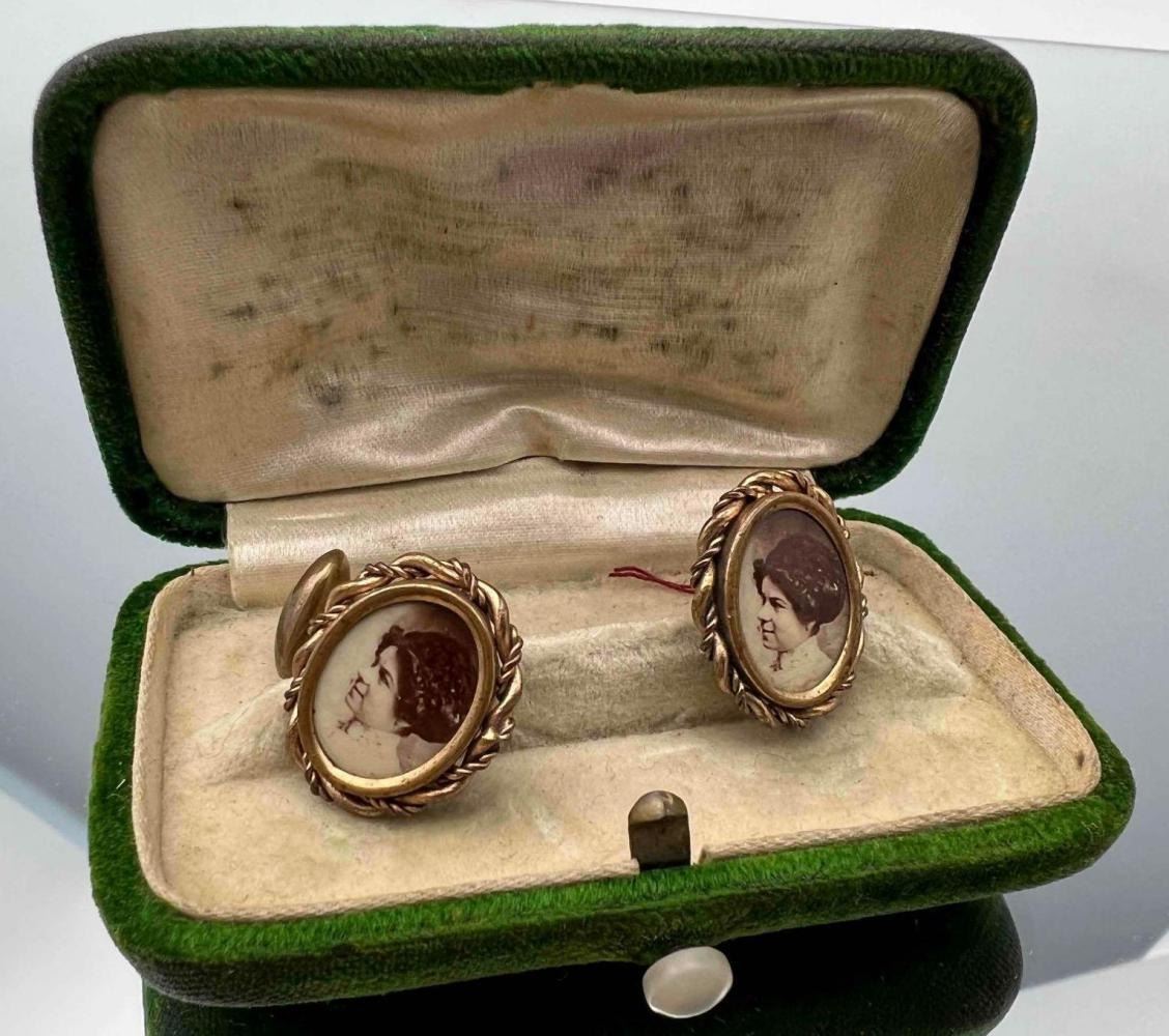 Antique Gold Plate Sweetheart Photo Cufflinks In Original Box. Unmarked. Approximately 0.75L x 0.625W in. Sight Approximately 0.5625L x 0.4375W in.
