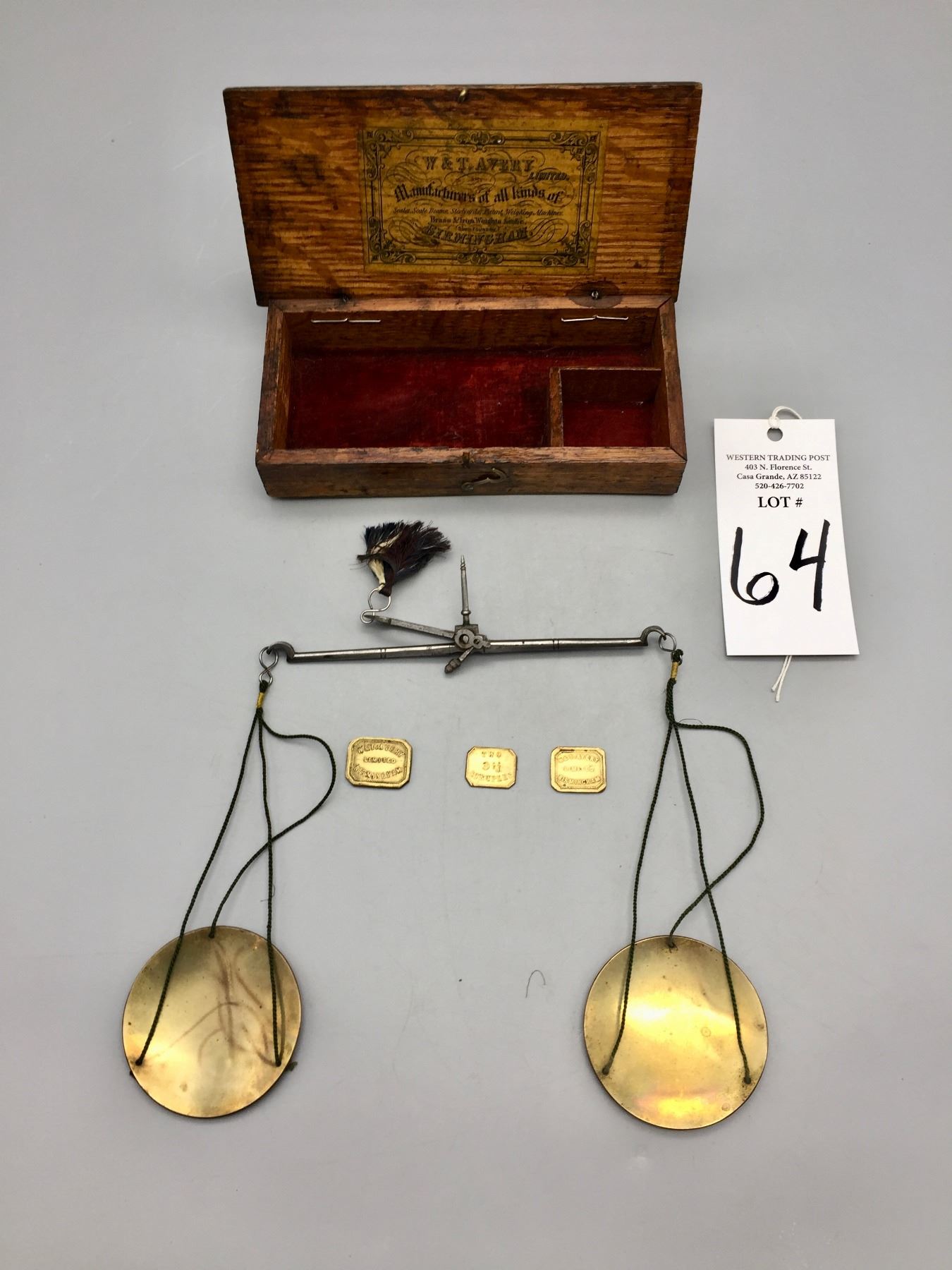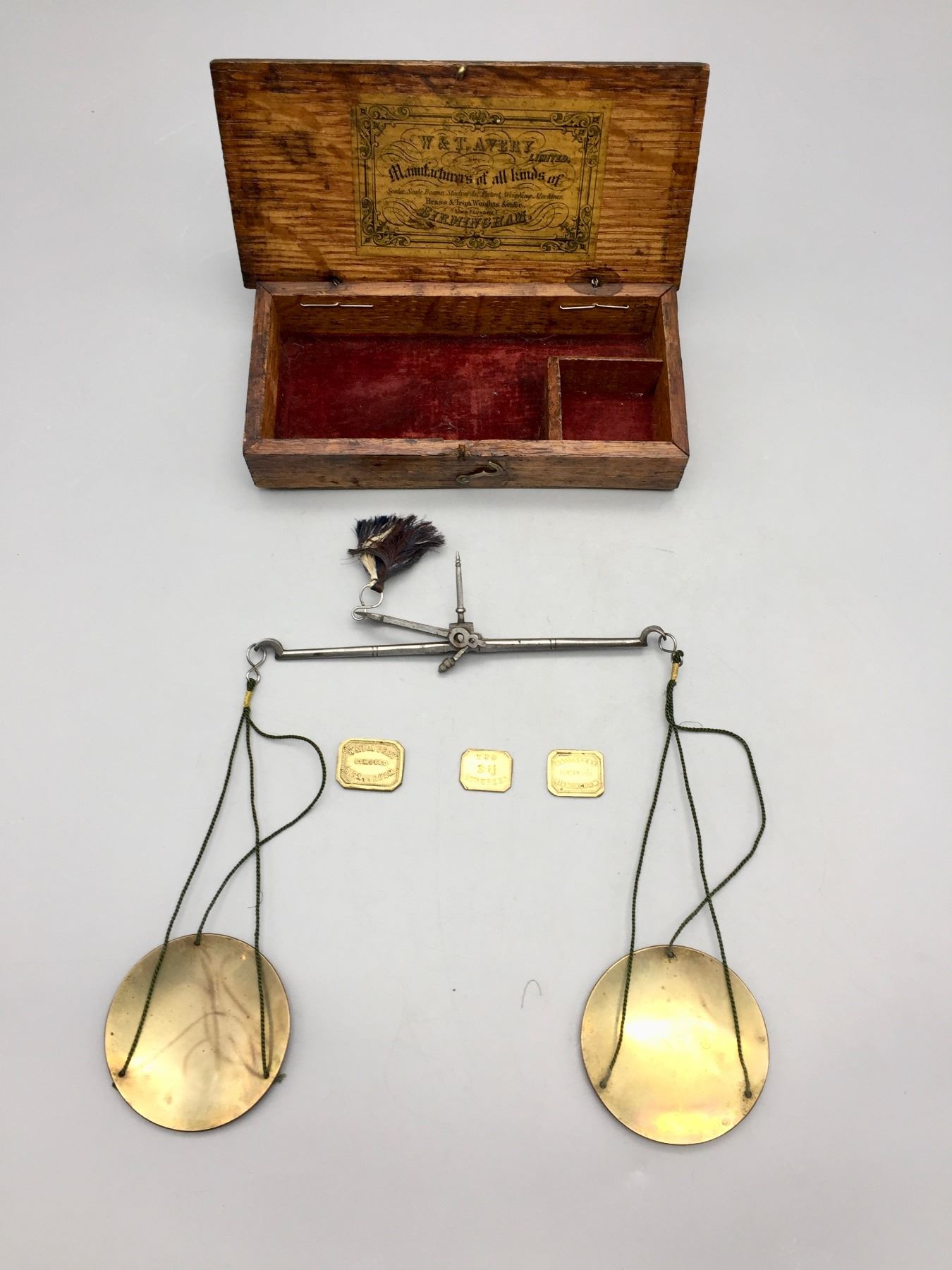 Description: Offered for sale in this lot is an antique gold scale in a wooden storage case manufactured by W and T Avery, Ltd. W and T Avery Ltd. is a British manufacturer of weighing machines. The company was founded in the early 18th century and took the name W & T Avery in 1818. Maker: W and T Avery Limited.