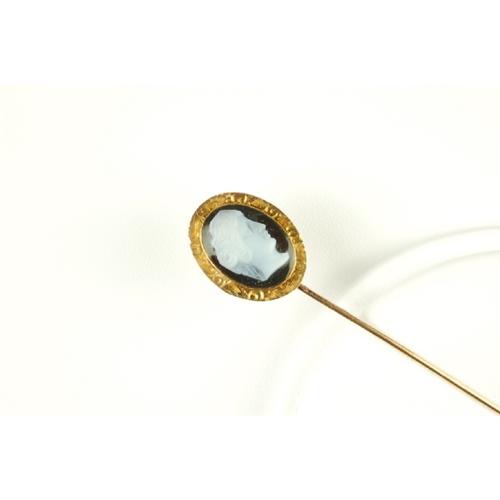 Antique 10K Gold Stickpin featuring an Oval CAMEO of a mans' profile (looks like Caesar) in white on a black background.