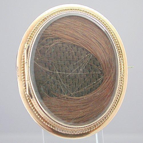 Unusual antique gold triple locket brooch circa 1870. This brooch is 15 kt. yellow gold and is of plain oval form with a beaded pattern at the base and twisted wire border on top. This is hinged along the side and has three compartments. These contain a total of four (4) locks of hair and each compartment has a woven background panel of darker brown hair. These are all protected by bevelled glass covers. This was made in Britain.