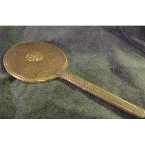 Antique Gold Vanity Hand Mirror. 12.5 Inches Tall. Very pretty detail on this mirror. Goldtone shows some tarnish toward the top of the back of the mirror. Needs cleaning, but didn't want to ruin the mirror by trying to clean it.