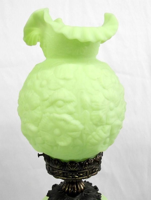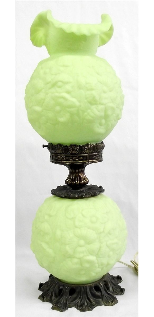 Antique Gone With the Wind Vaseline Glass Lamp. Double globe electric lamp that works and looks terrific, in the style fashionable during the era depicted in the movie ''Gone With the Wind.'' With brass stand. Measures 23''H x 9''W.