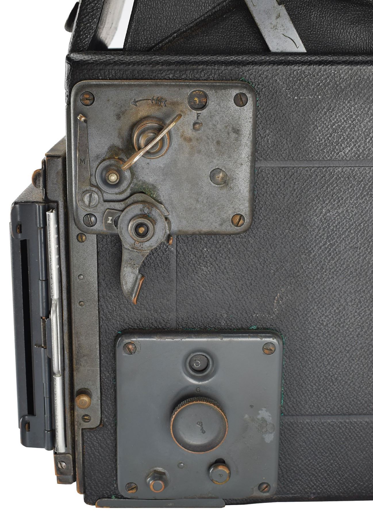 Antique Graflex Series C revolving back camera, measuring 9? x 6? x 7? when folded, fitted with a Taylor-Hobson Cooke 6.5-in f/2.5 anastigmatic lens. The camera features a pop-up focusing hood and lens cover. Includes a worn carrying case and original instruction booklet. In very good to fine condition.