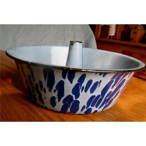 Antique Graniteware Funnel Cake Pan. Really unique antique graniteware pan! This funnel cake pan has a pale blue interior; seamed funnel, and large, splotchy blue pattern on outside. It resembles what is known as Columbian ware which is what it might be, (see H. Greguire's book on gw). It is quite heavy, and in good display condition! Just a couple dots of enamel missing off bottom. It is 9.75 inches wide and 3.25 inches tall. A great piece for the serious gw collector! Thanks for visiting More Than McCoy!