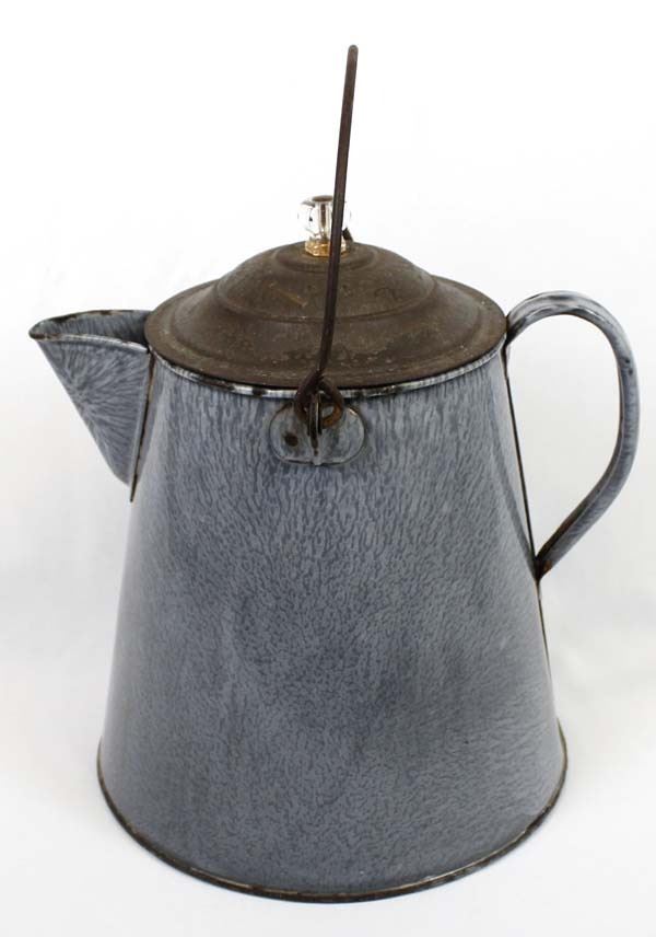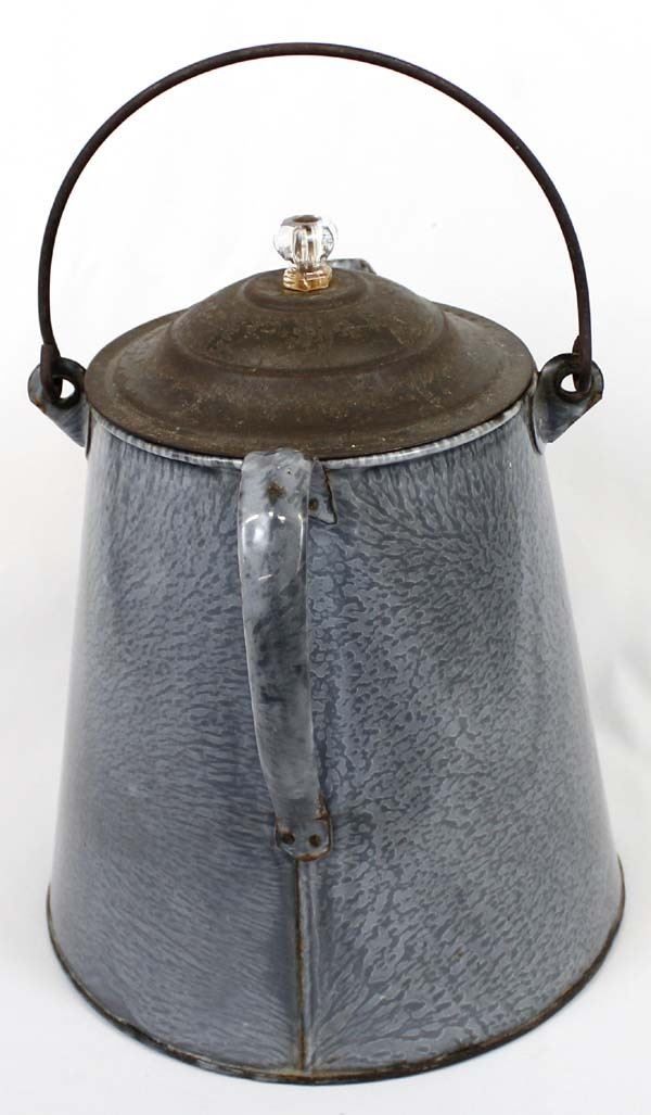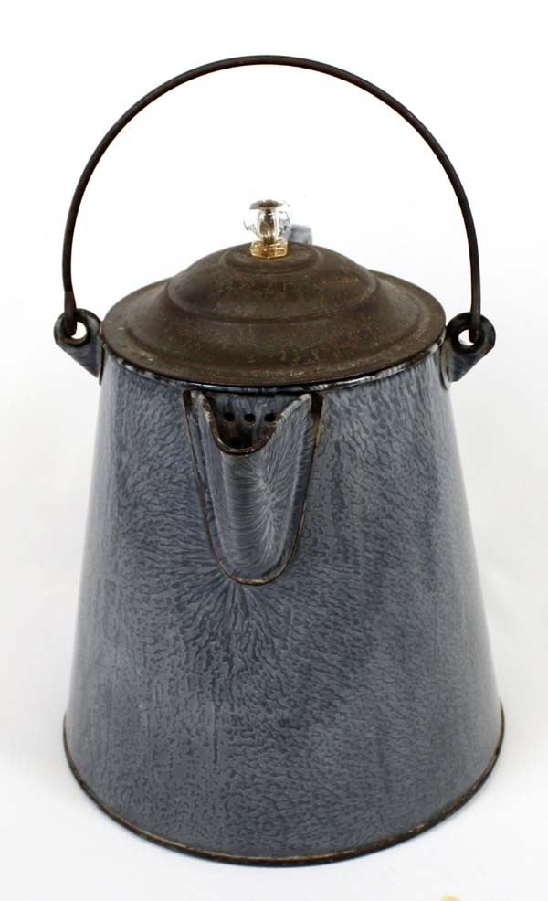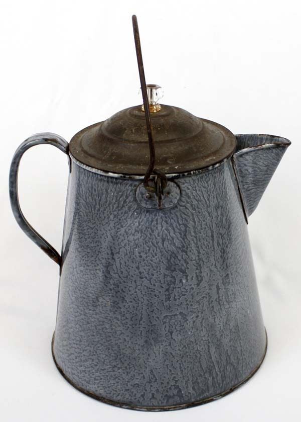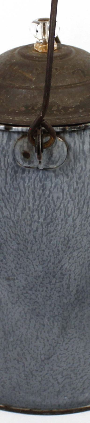 Antique Gray Graniteware Lidded Coffee Pot, measures 11'' x 12'', lid has clear knob handle on lid