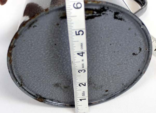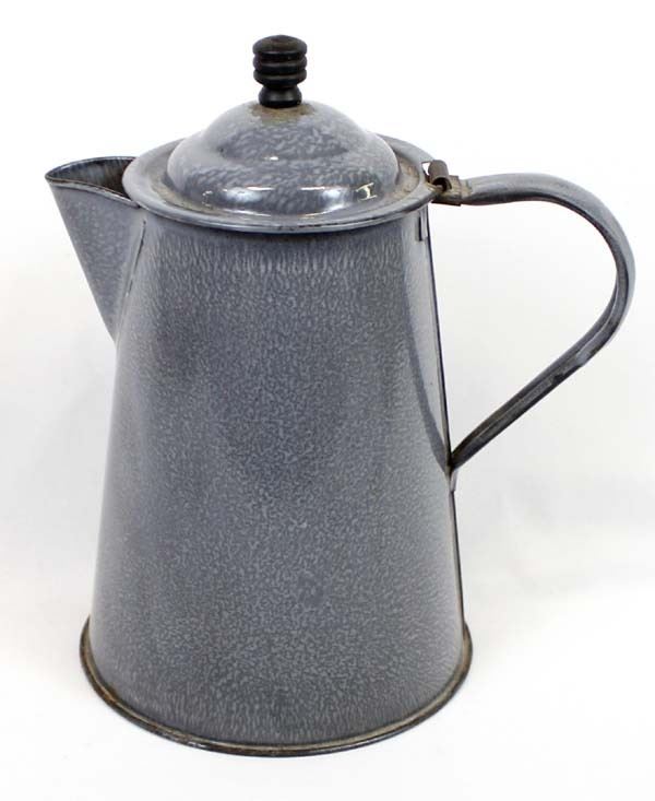 Antique Gray Graniteware Lidded Coffee Pot, measures 8'' x 10'', wood knob handle on lid