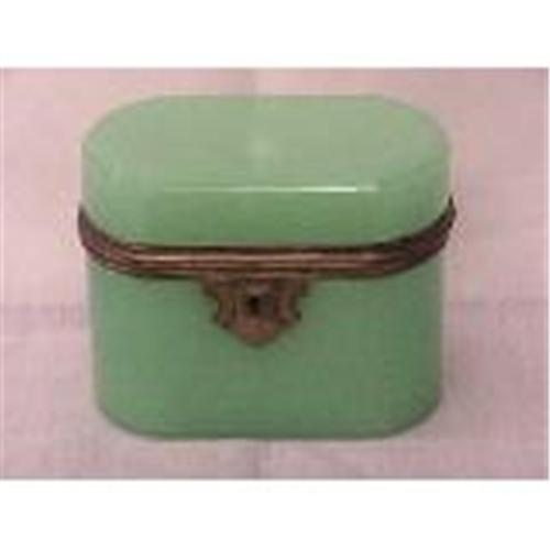 This is A very nice and collectable Green Opaline Jewelry Box with Bronze rims in very good condition(small factory defect inside the box as shown on the picture, but it is just on the surface not through the glass, it is like A flake.)