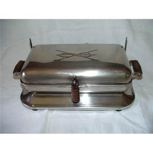 Antique griddle with wooden side handles and front drop handle. Griddle needs surface cleaning with oven cleaner, but in excellent working condition. Very pretty piece made in the 1920's or 1930's. No manufacturers mark, but interesting rope and cross swords design on the top.