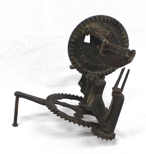 Antique H. Keyes Turntable Apple Peeler, 1856, measures 6'' x 7.5'', marked ''Patented by H. Keyes June 17, & Dec. 16, 1856''