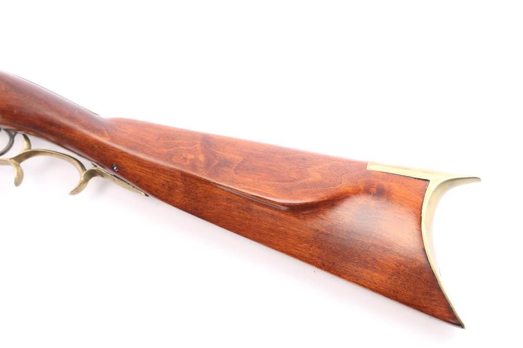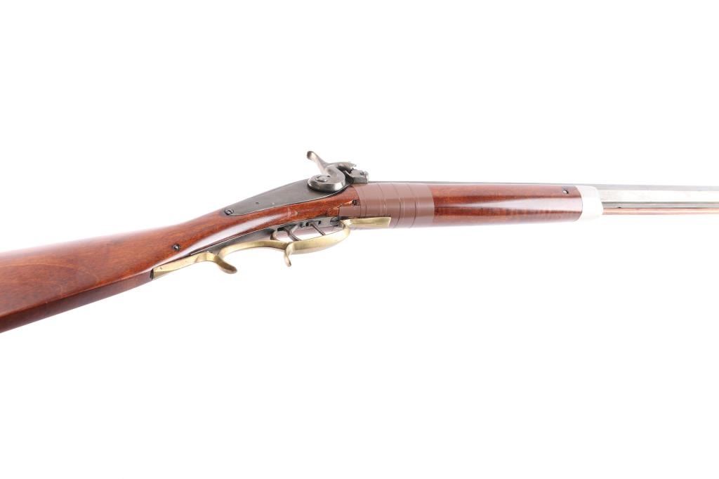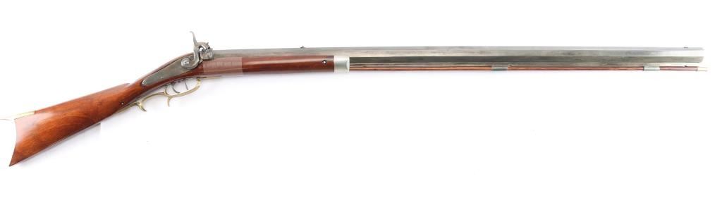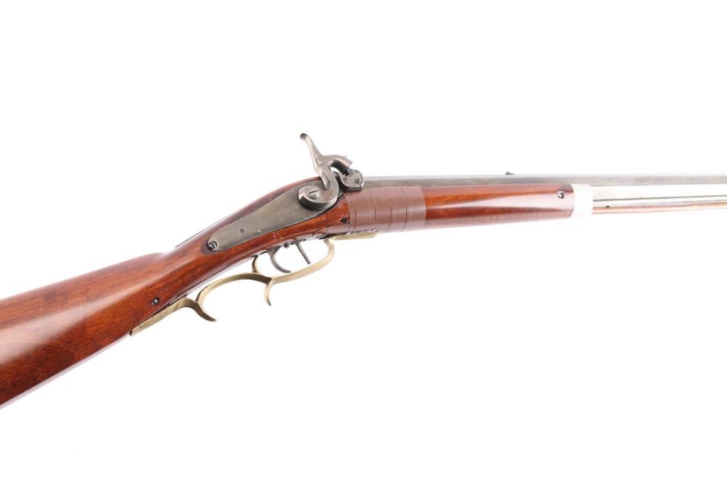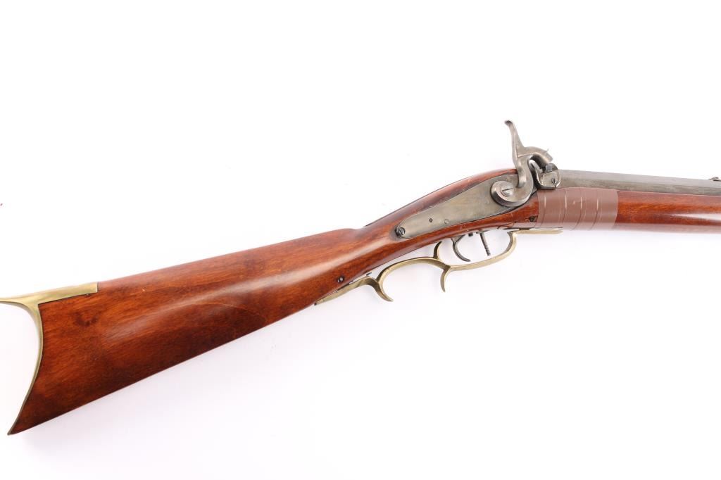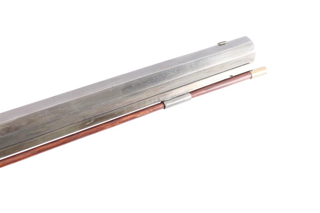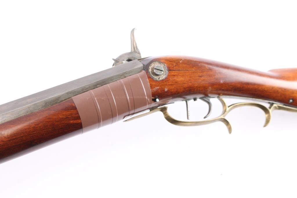 Antique half stock percussion rifle. Unsigned. Features a 37 1/4" heavy octagonal barrel with low profile blade in dovetailed brass base front and fixed notch rear sights, brass finger groove triggerguard & brass crescent buttplate, double set trigger, brass tipped wooden ramrod. The two-cock hammer action works well, the stock is cracked forward of the triggerguard and repaired with tape, the metal has been cleaned at some point and the stock has been varnished. The rifled bore is very good, dusty.