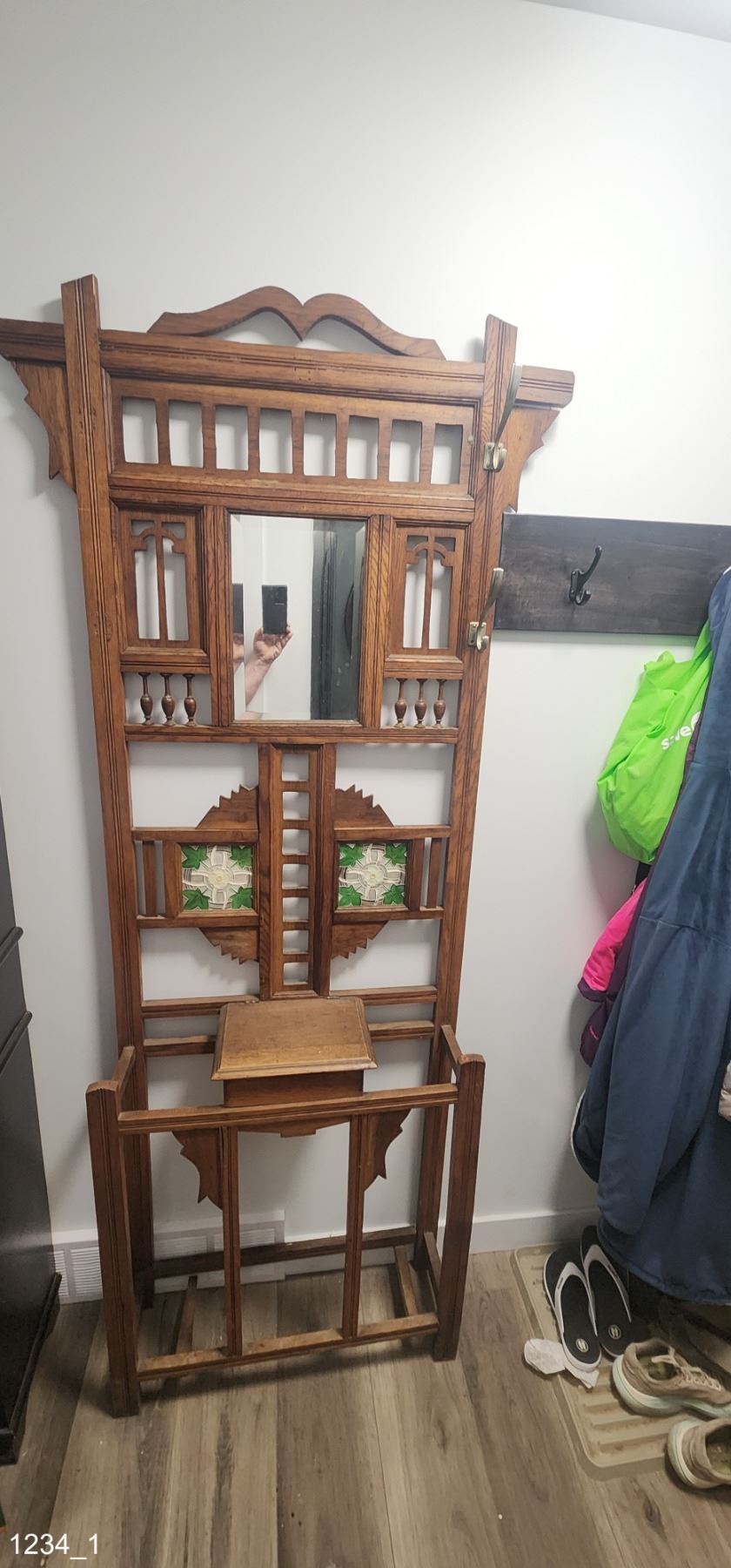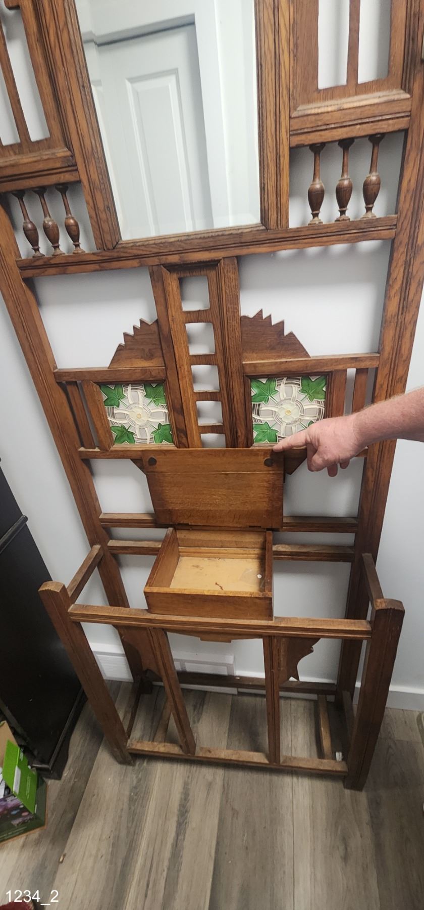 Antique Hall Tree with Umbrella Stand and Coat hooks. Has mirror and decretive stained glass panels. Also has a small storage box for keys etc. Missing two coat hooks from left side of stand.
