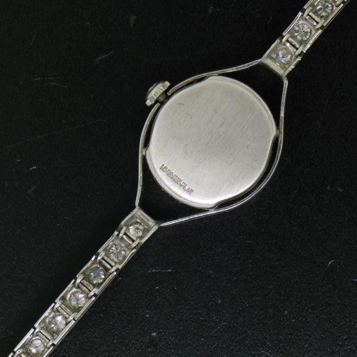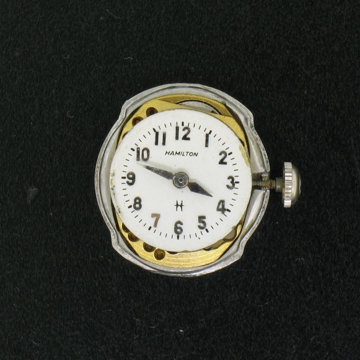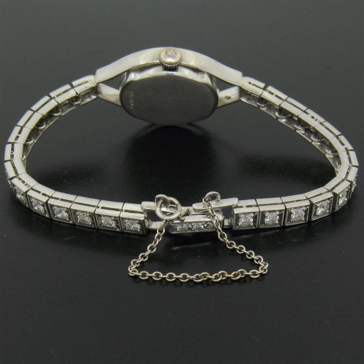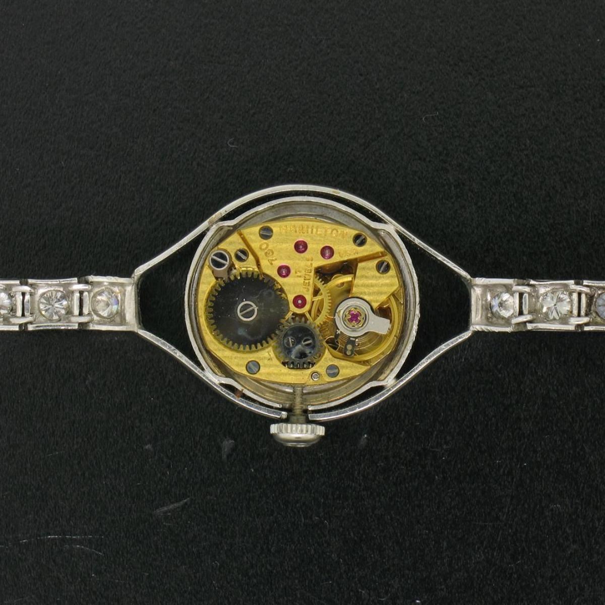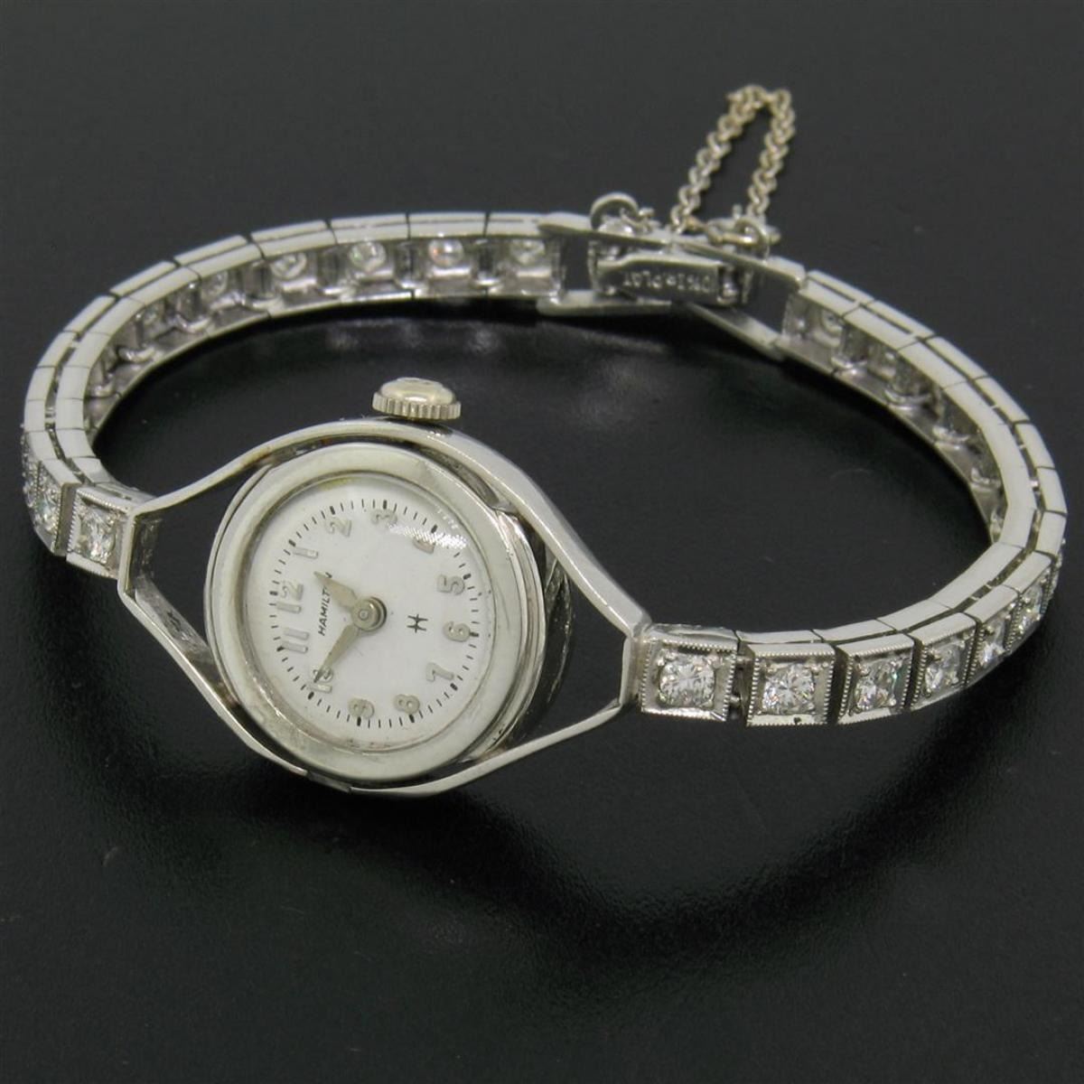 A vintage platinum ladies' watch featuring a caliber 780 hand-winding mechanical movement from Hamilton that keeps accurate time. The bracelet features 29 round transitional cut diamonds (F/G - VS2/SI1; 1.61ctw). The case measures approximately 20mm wide, the watch weighs a total of 23.39 grams, and it will comfortably fit up to a 5.75 inch wrist.